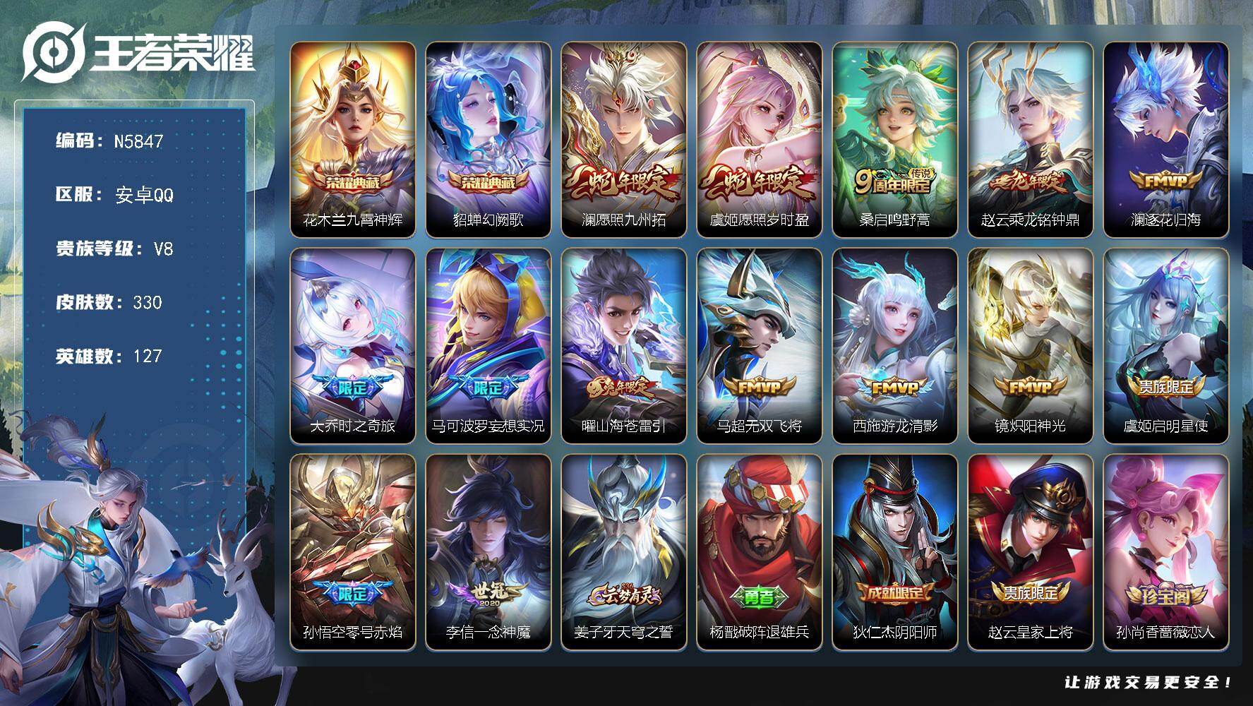 安卓Q-V6-最强王者段位-127英雄-330皮肤-2典藏皮肤-14传说-91史诗