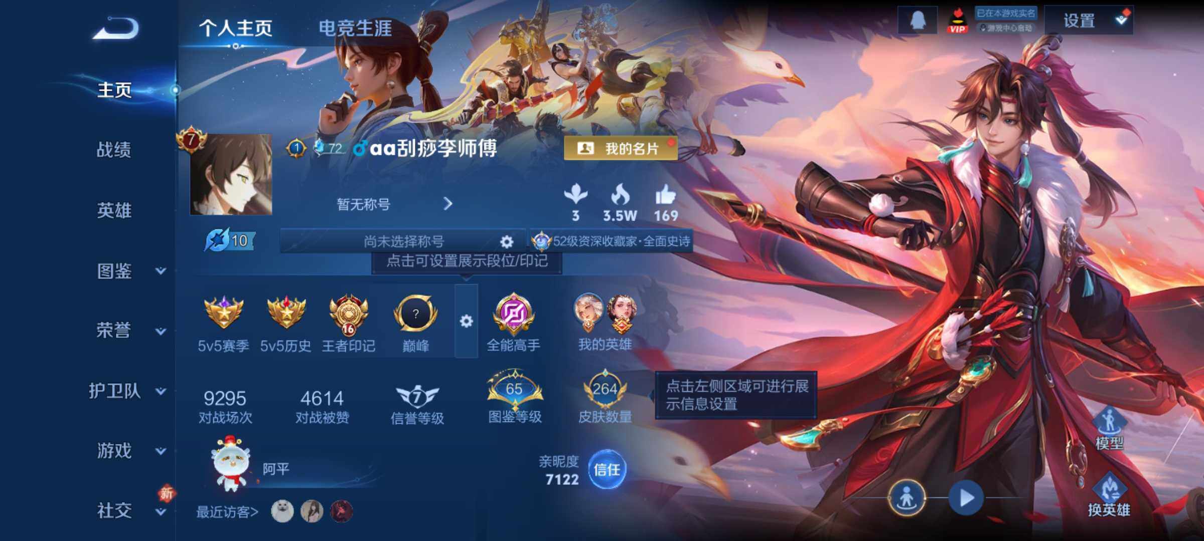 【16776154】安卓Q-V7-最强王者段位-128英雄-264皮肤-1典藏皮肤-1珍品传说-16传说-87史诗