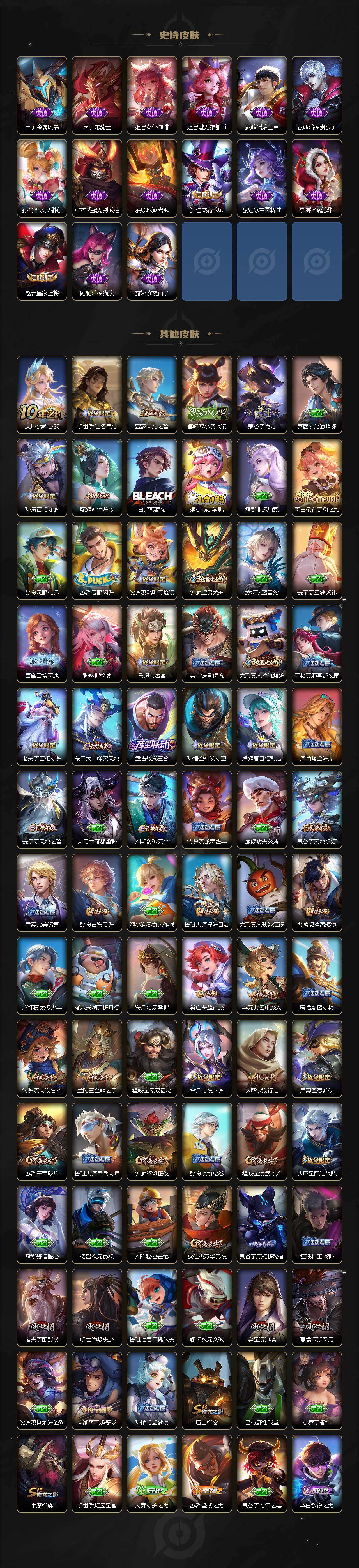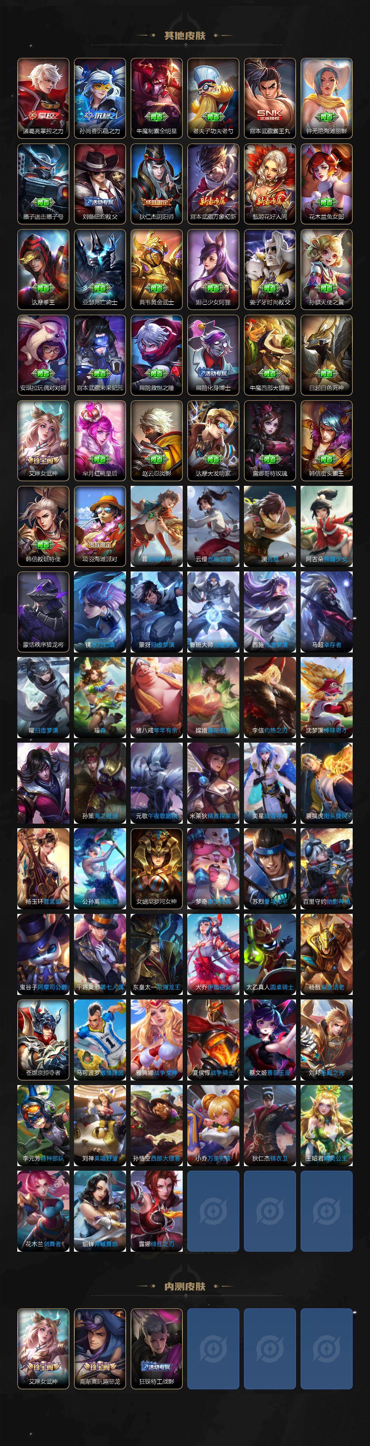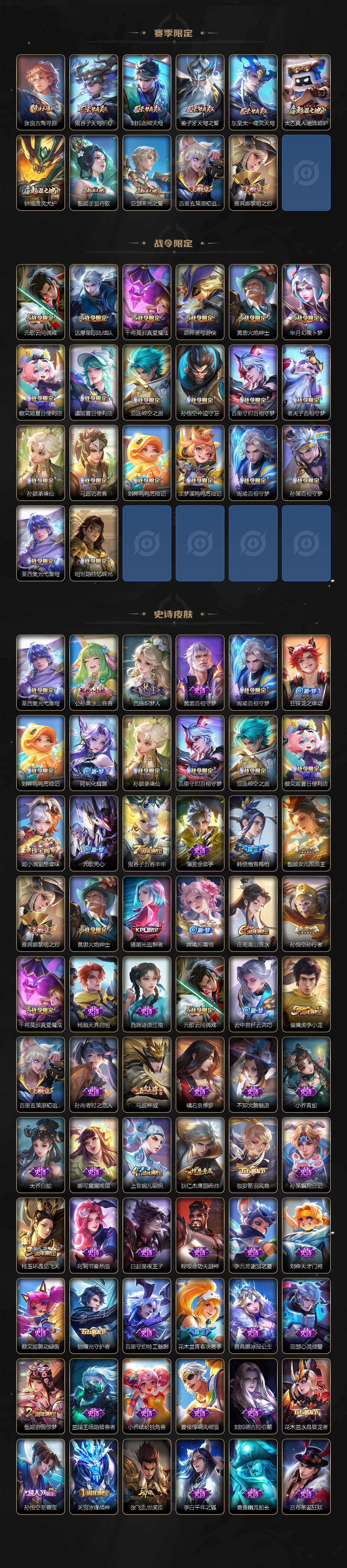【限定皮肤】:蔡文姬夏日便利店,虞姬夏日便利店,姜子牙天穹之誓,狄仁杰阴阳师,赵云皇家上将,孙尚香异界灵契,庄周高山流水,高渐离玩趣恶龙,芈月幻夜卜梦,元歌云间偶戏,元歌