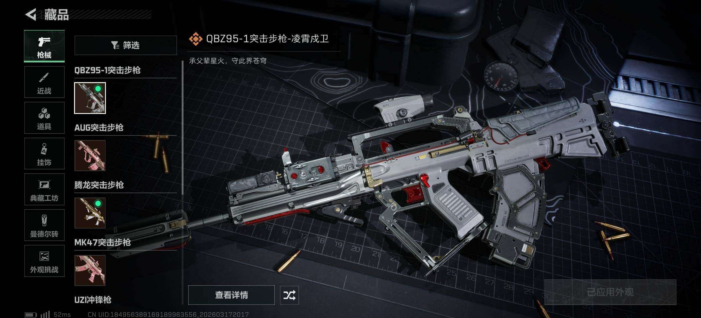【传说外观】:QBZ95-1突击步枪-凌霄戍卫,AUG突击步枪-悠然茶歇,腾龙突击步枪-万金泪冠,MK47突击步枪-悠然茶歇,UZI冲锋枪-悠然茶歇,勇士冲锋枪-万金泪冠,AWM狙击步枪-万金泪冠,.357左轮-缄花