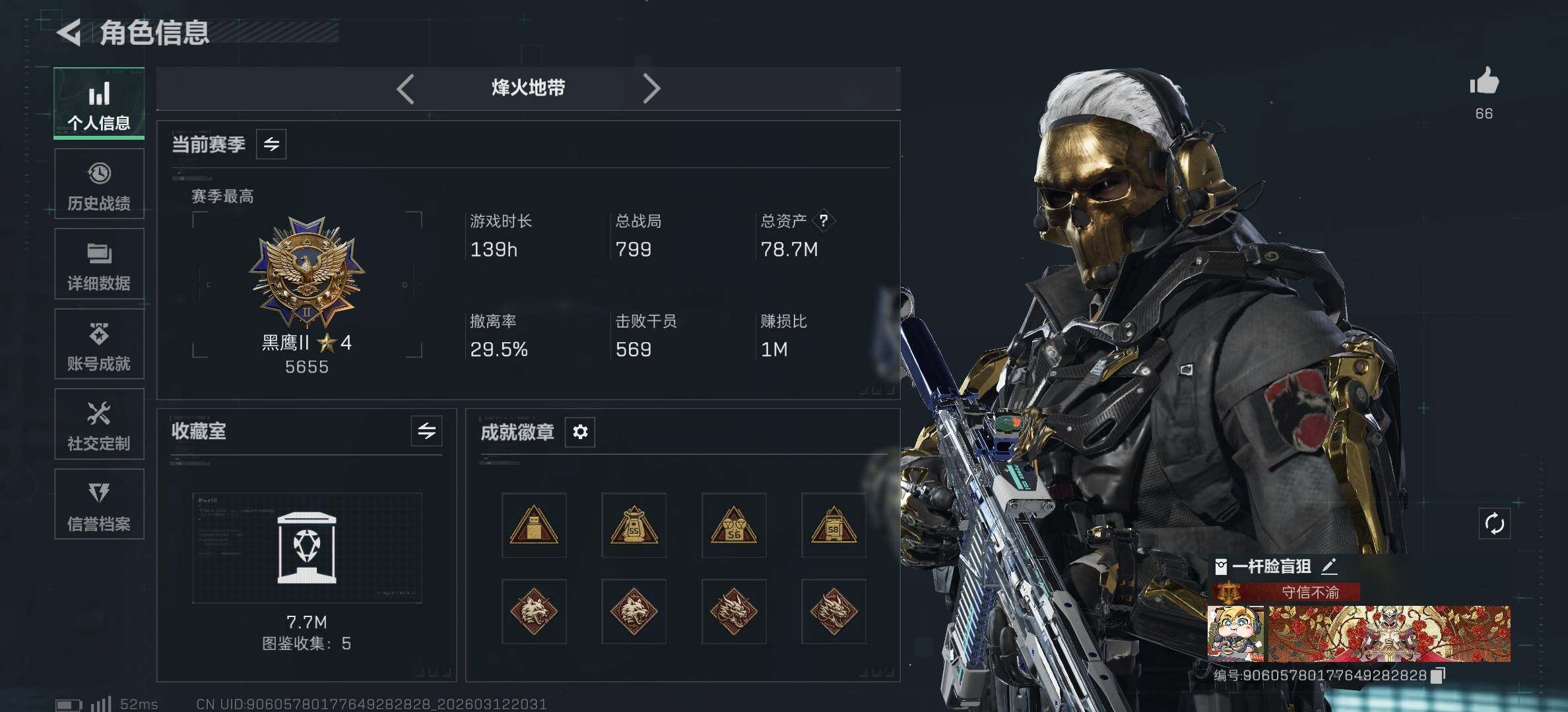 77m总资产-369k哈夫币-60烽火等级-黑鹰-20战场等级-上等兵