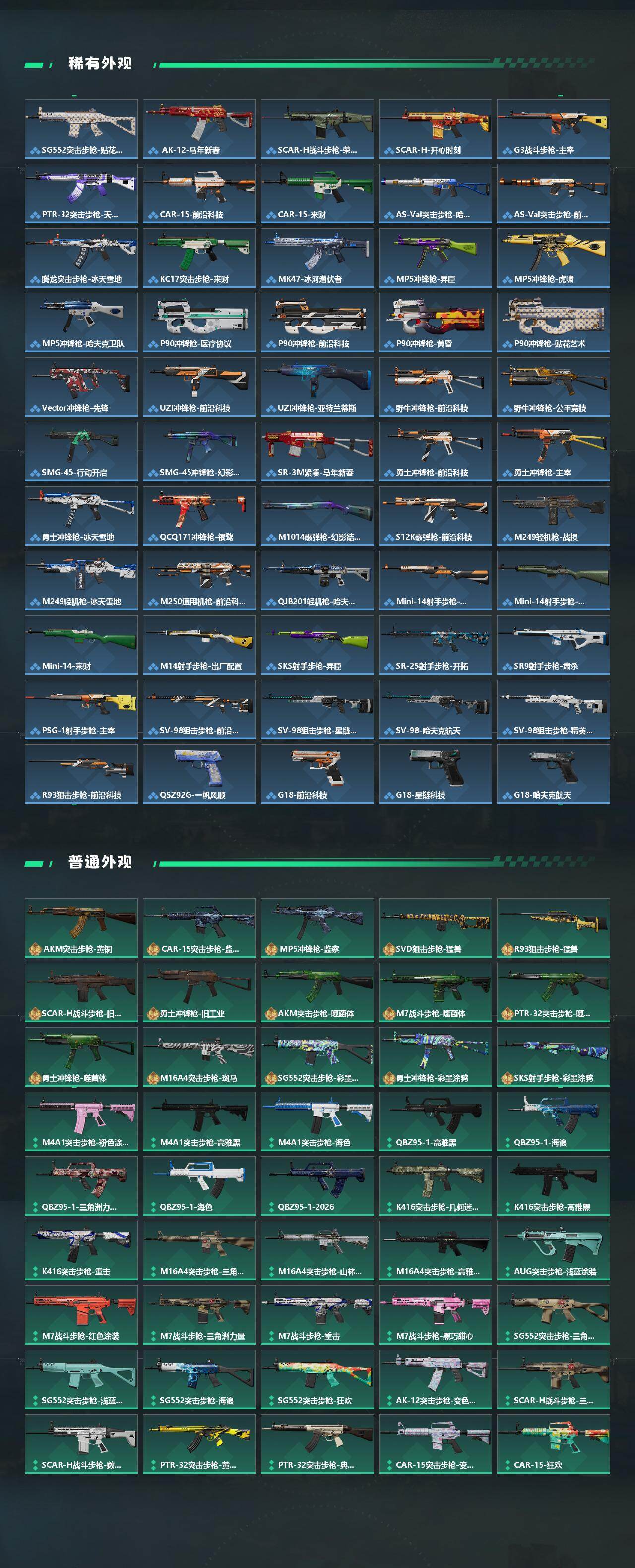 【传说外观】:M4A1突击步枪-阿米娅,AKM突击步枪-锦绣,ASh-12战斗步枪-鹅鸭杀,AUG突击步枪-悠然茶歇,SG552突击步枪-运动员,AK-12突击步枪-特斯拉线圈,