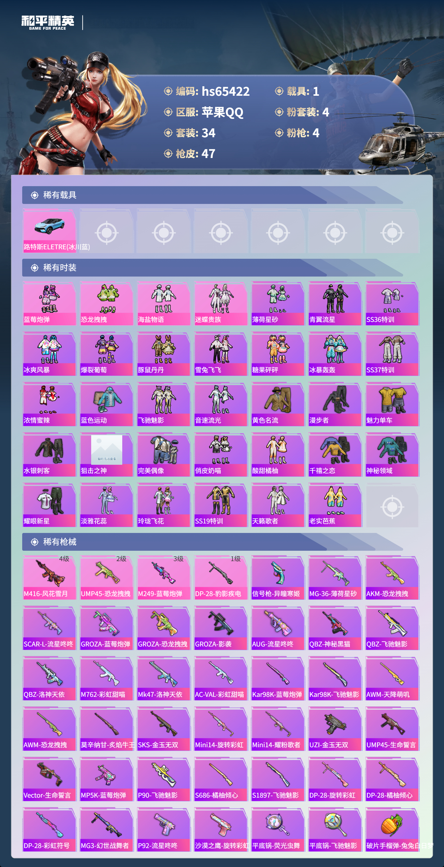 hs65422 苹果手Q-1王牌印记-4粉装-4特效枪-1载具-19149热力值-34套装-47枪皮