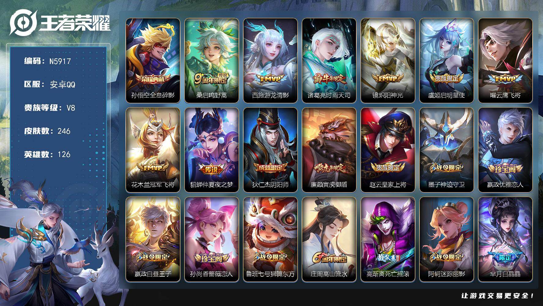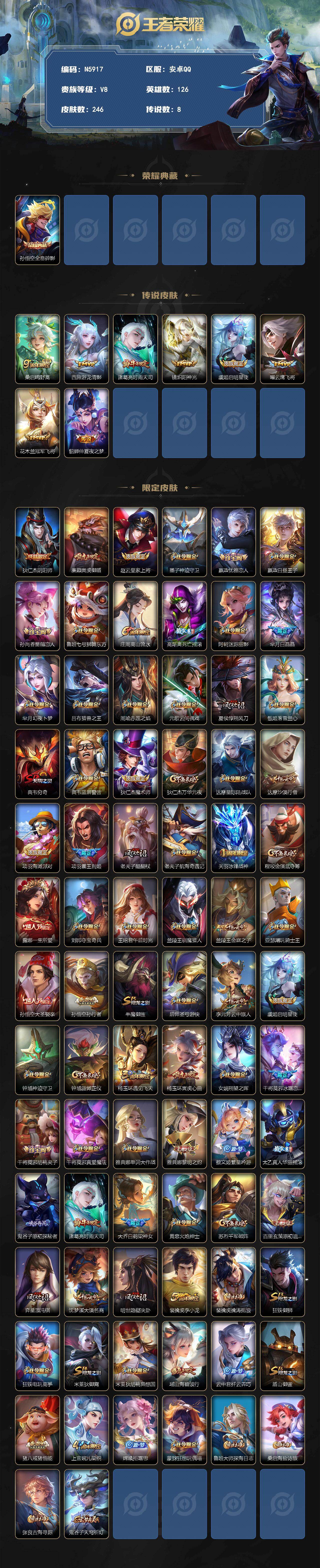 安卓Q-V7-尊贵铂金II段位-126英雄-246皮肤-1典藏皮肤-8传说-69史诗