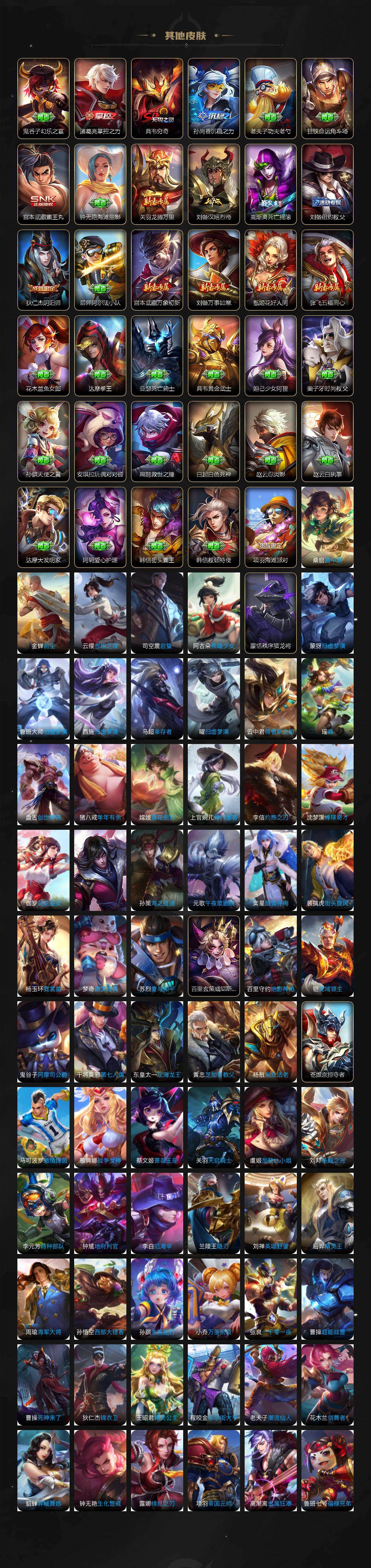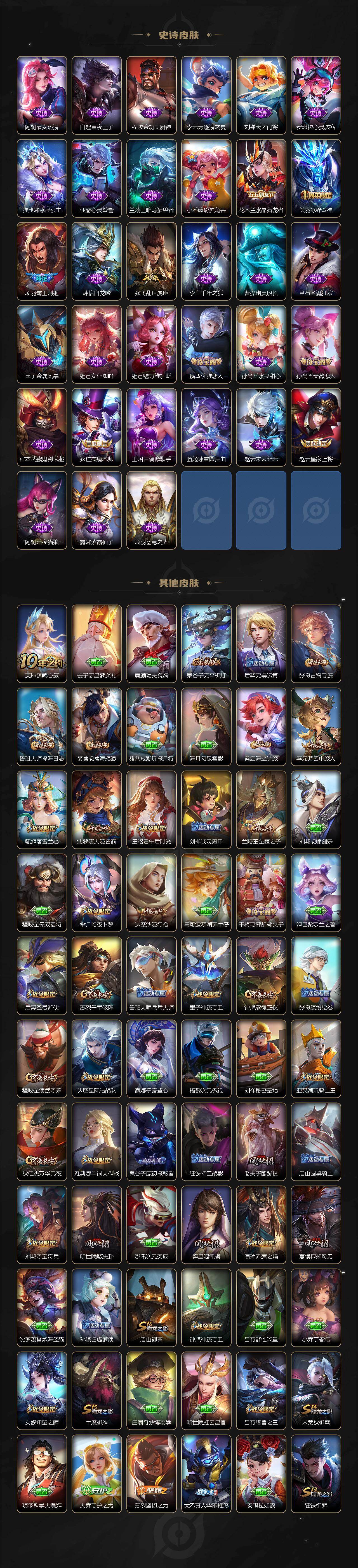 【限定皮肤】:狄仁杰阴阳师,廉颇寅虎御盾,赵云皇家上将,墨子神迹守卫,嬴政优雅恋人,嬴政白昼王子,孙尚香蔷薇恋人,鲁班七号狮舞东方,庄周高山流水,高渐离死亡摇滚,阿轲迷踪丽影,芈月白晶晶,芈月幻夜卜梦,吕布猎兽之王,周瑜赤莲之焰,元歌云间偶戏,夏侯惇朔风刀,