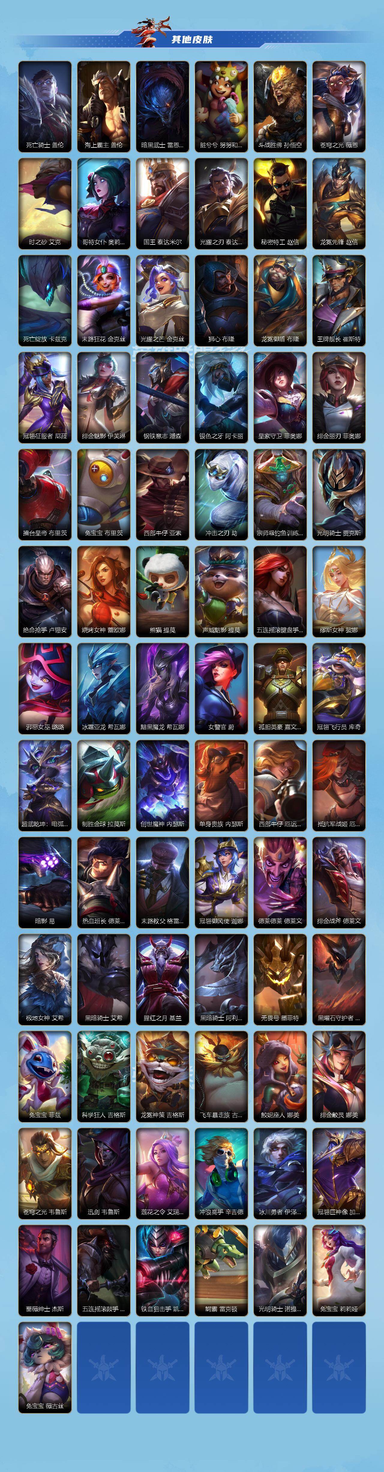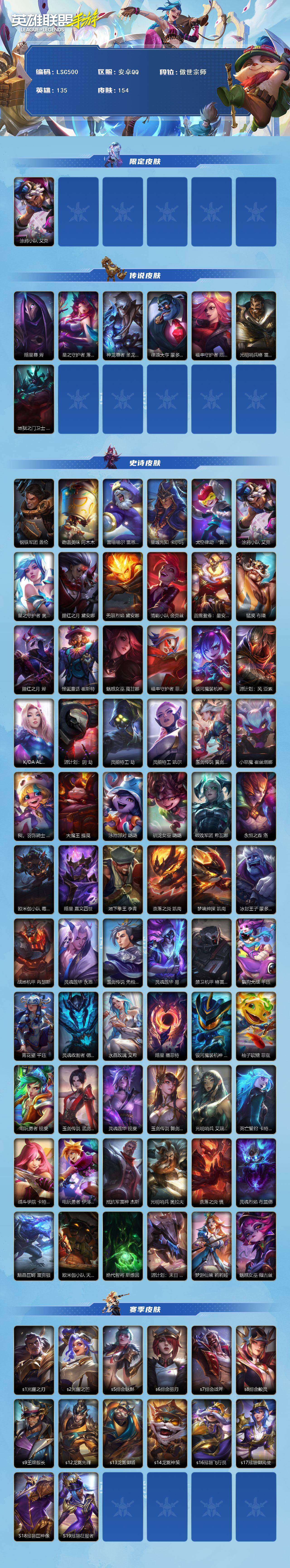 【LSC500】135英雄/154皮肤/1神话/7传说/傲世宗师/涂鸦小队 艾克/暗星尊 烬/星之守护者 落 霞/神龙尊者 圣龙 李青/律政大亨 蒙多医生/福牛守护者 厄运小姐/光明哨兵 格雷福斯/地狱之门卫士 加里奥/钢铁军团 盖伦/劲道美味 阿木木/雷喵喵尔 雷恩加尔/星域先知 卡尔玛/太空律动 “舞林双子” 努努和威朗普/星之守护者 奥莉安娜/腥红之月 黛安娜/无限烈焰 黛安娜/清剿小队 金克丝/蕊雪盈春:晏安 赫卡里姆/猛虎 布隆/腥红之月 烬/怪诞童话 崔斯特/魅惑女巫 莫甘娜/福牛守