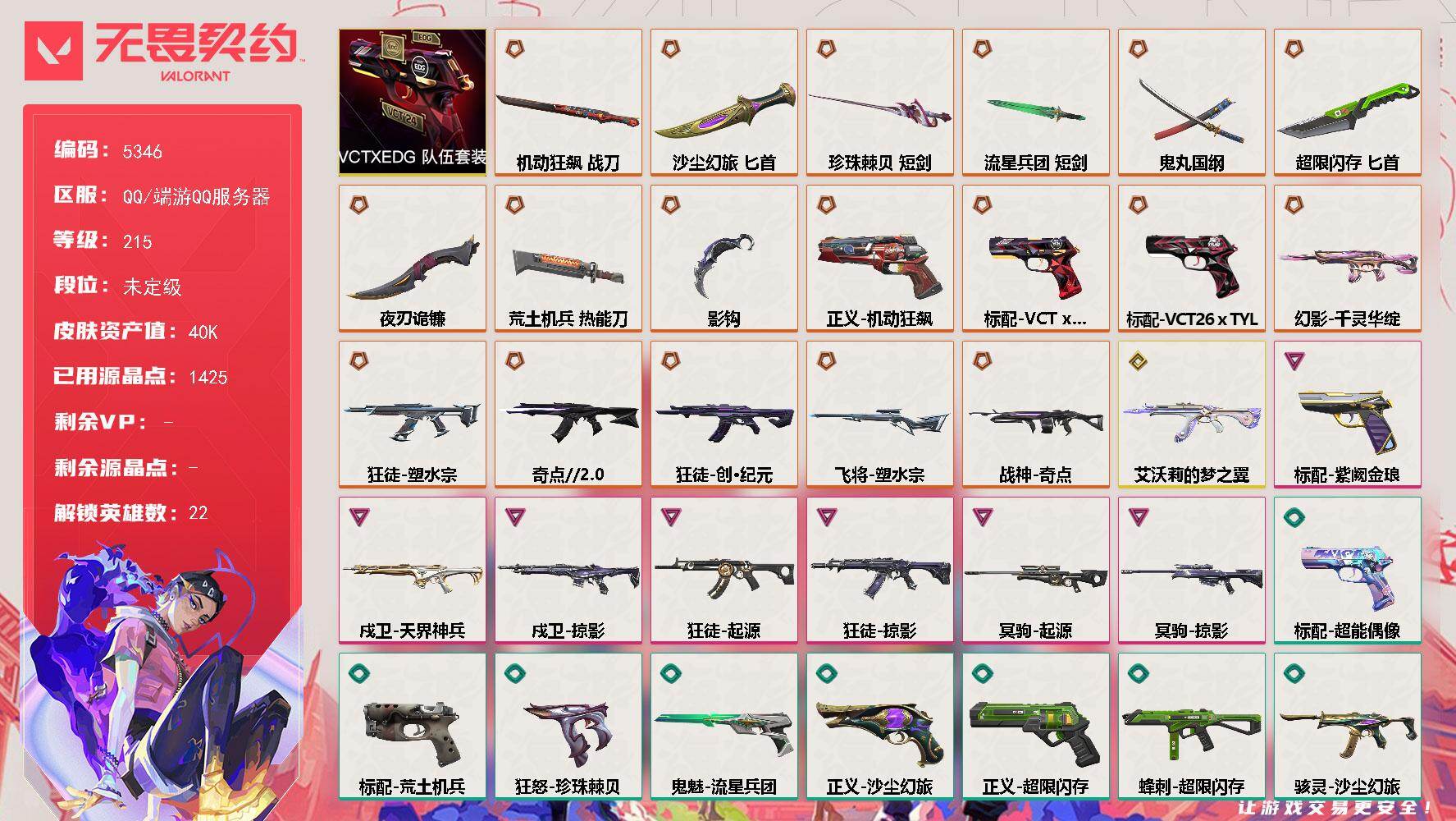 【套装】:VCTxEDG 队伍套装【英雄】:炼狱,维斯,暮蝶,壹决,捷风,雷兹,幽
