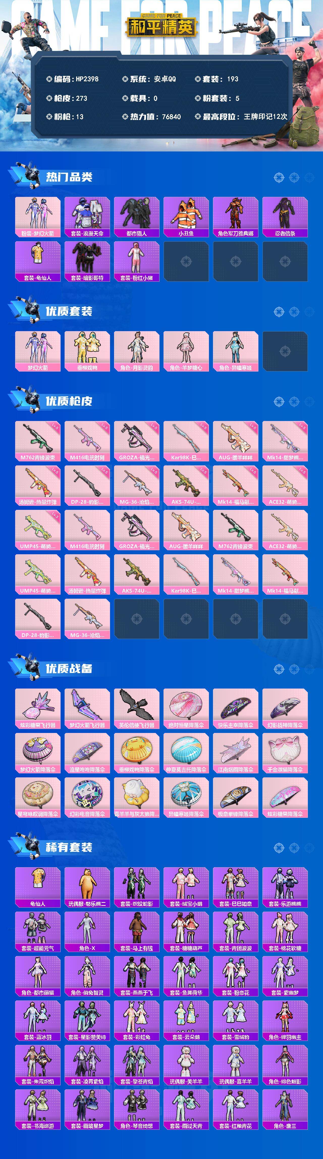 【HP2398】193套装/枪械13/装备318/战备199/王牌印记12/热力值76840/五级M416-电玩时刻/五级GROZA-镜光银凌/五级AUG-暖羊咩咩/五级M762-青锋波束/五级ACE32-萌骑漫游/三级UMP45-萌骑冒险/五级汤姆逊-热量炸弹/五级AKS-74U-森灵之息/五级Kar98K-巳巳如意/五级Mk14-甜梦熊击/五级Mk14-福马献瑞/五级DP-28-豹影疾电/五级MG-36-沧焰双生/粉装-梦幻火箭/套装-浪漫天命/套装-都市猎人/套装-小丑鱼/角色-军刀雅典娜