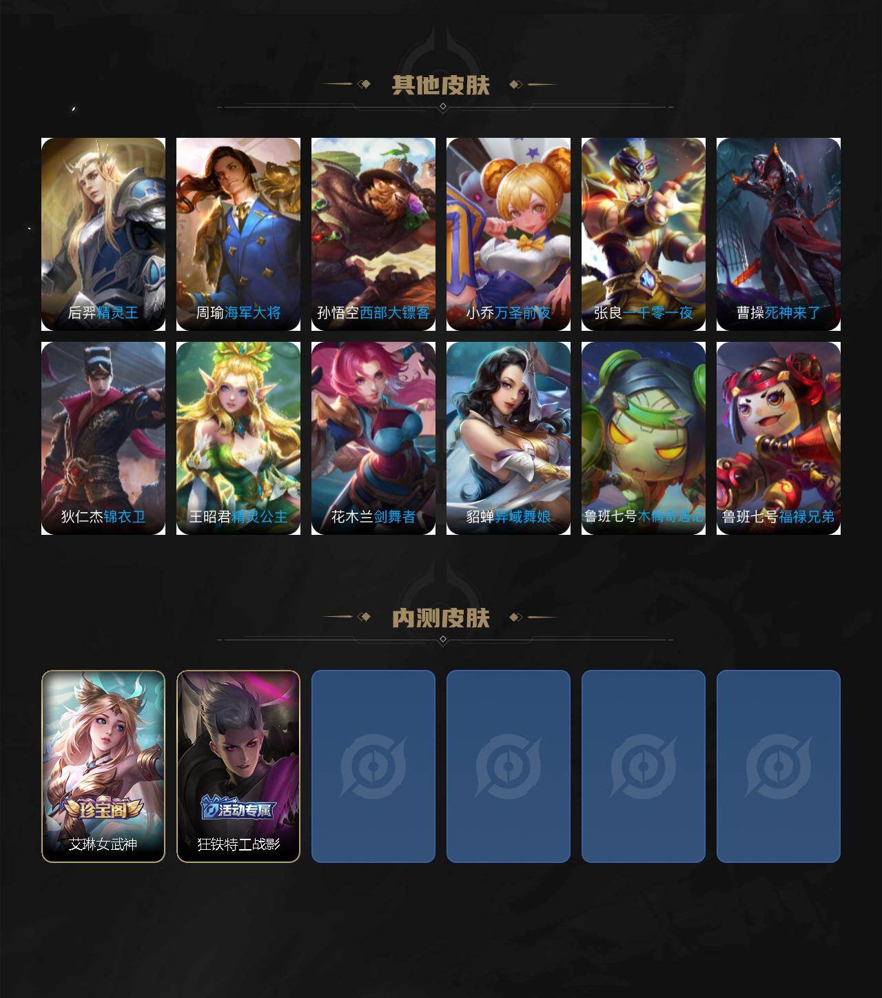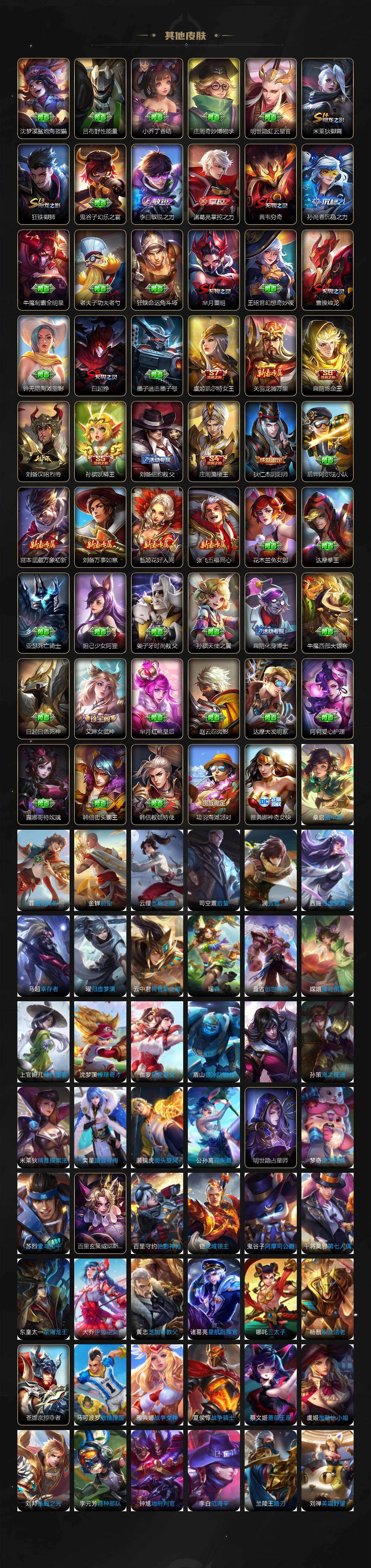 【传说皮肤】:公孙离云诺千山,澜愿照九州拓,云缨幻光神枪,桑启鸣野蒿,典韦战鼓燎原,孙尚香乘龙问璇玑,赵云乘龙铭钟鼎,吕布遇见神鼓,诸葛亮鹤羽星尊,李白诗剑行,马可波罗深海之息,孙策末日机甲,赵云淬星耀世,虞姬启明星使,宫本武藏地狱之眼,孙悟空地狱火,狄仁杰超时空战士