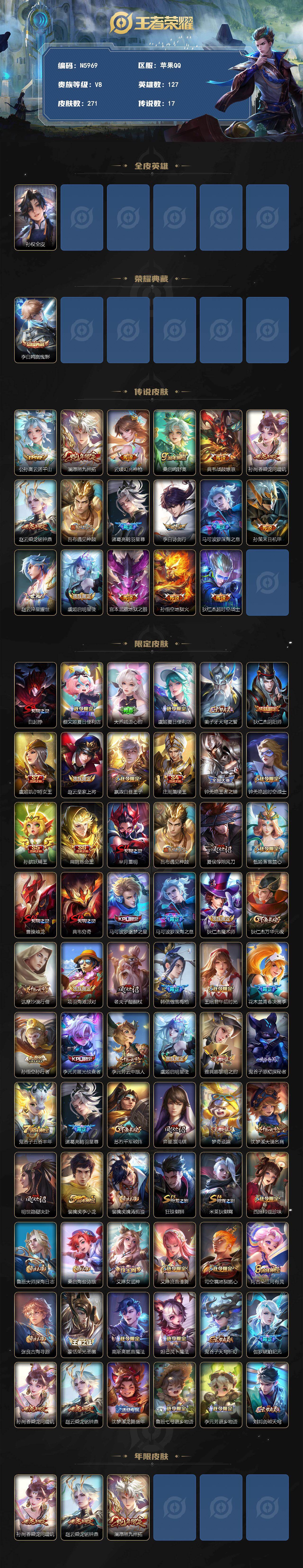 苹果Q-V6-最强王者段位-127英雄-271皮肤-1典藏皮肤-17传说-67史诗