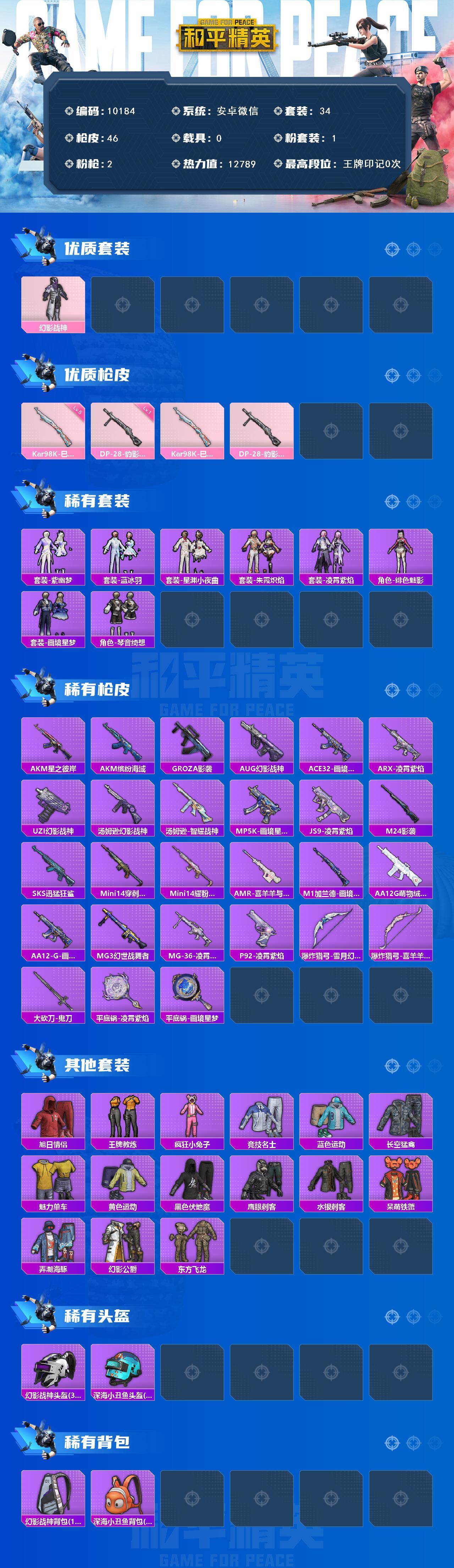 安卓 微信-1粉装-2特效枪-0载具-1粉色飞行器-12789热力值-0王牌印记-34套装-46枪皮