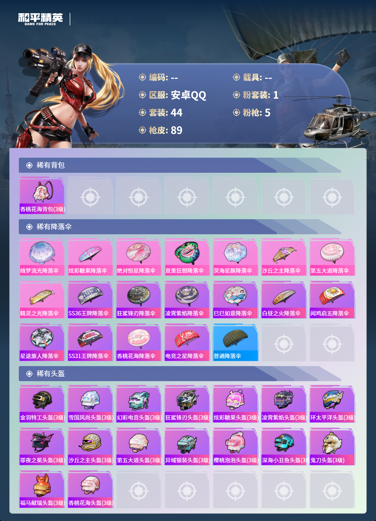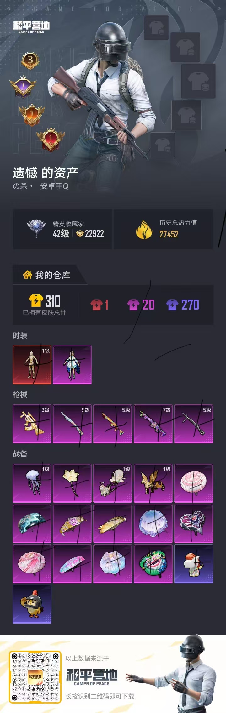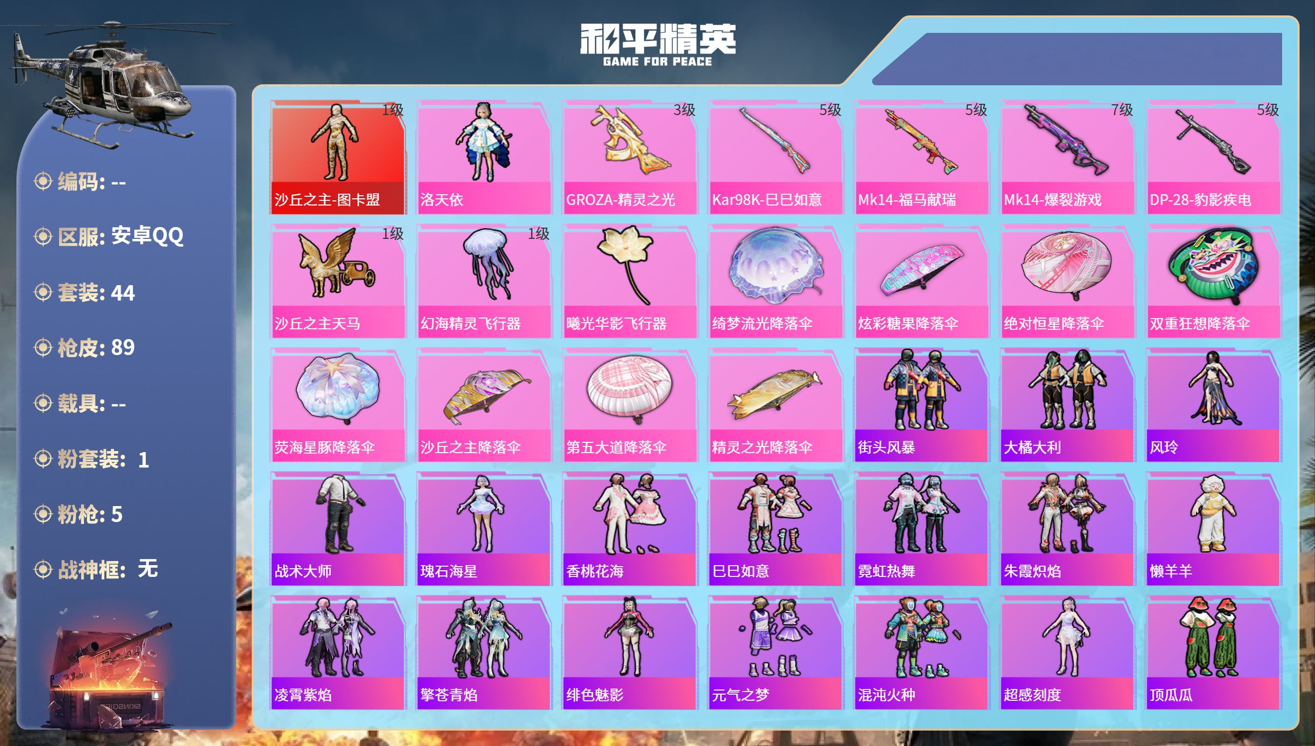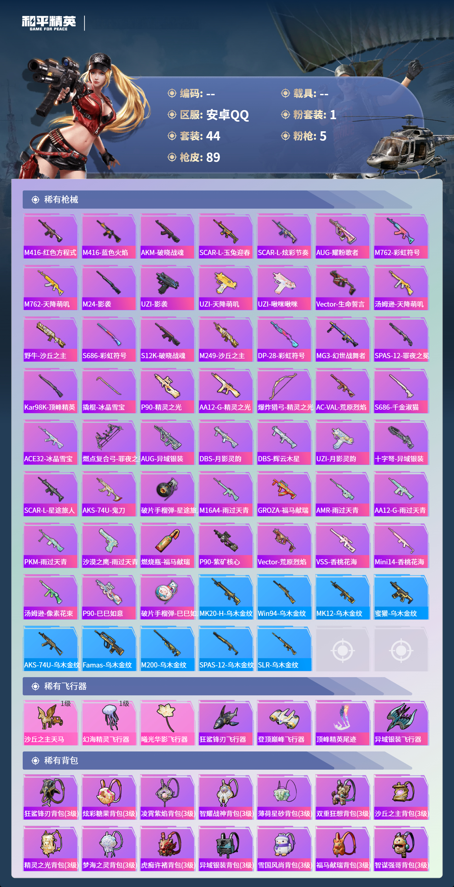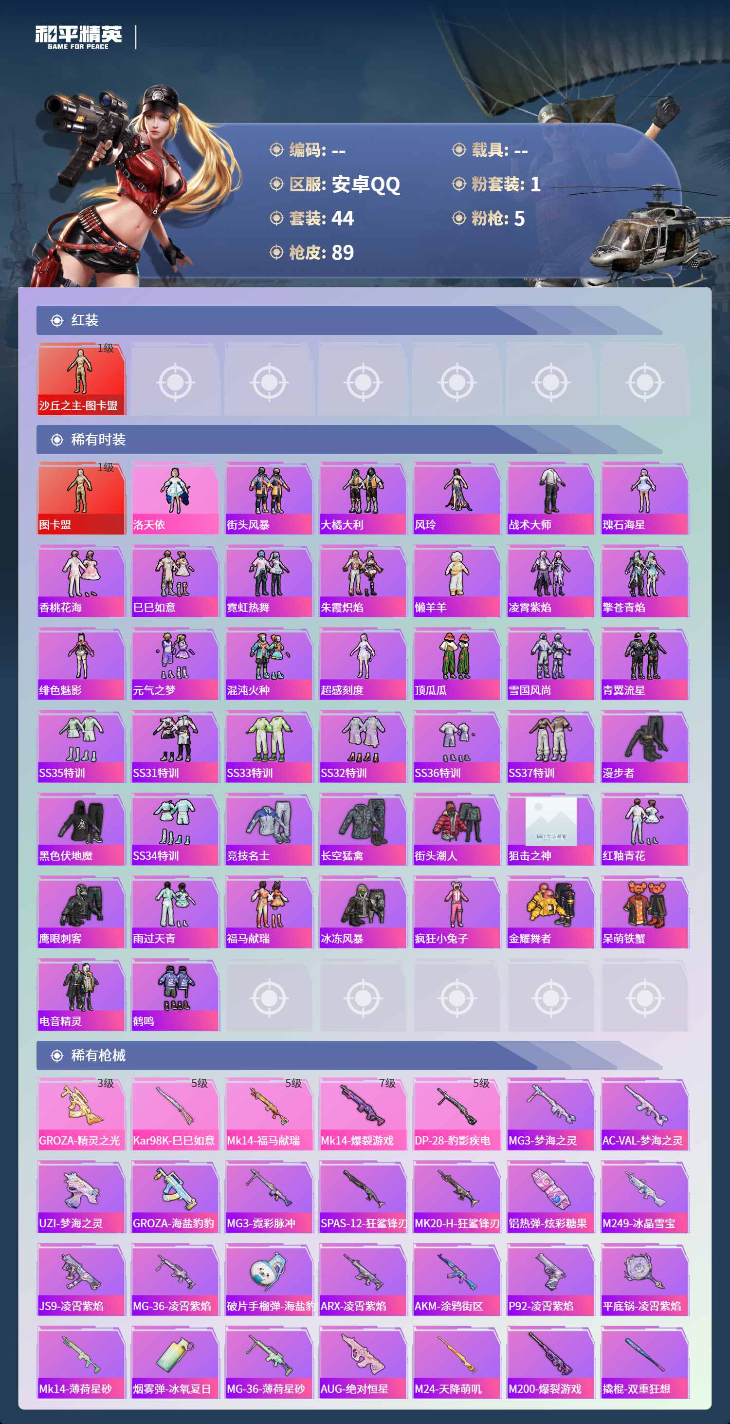 hs65356安卓手Q-3王牌印记-1红装-1粉装-5特效枪-27482热力值-44套装-89枪皮-1卓越印记-1传奇印记