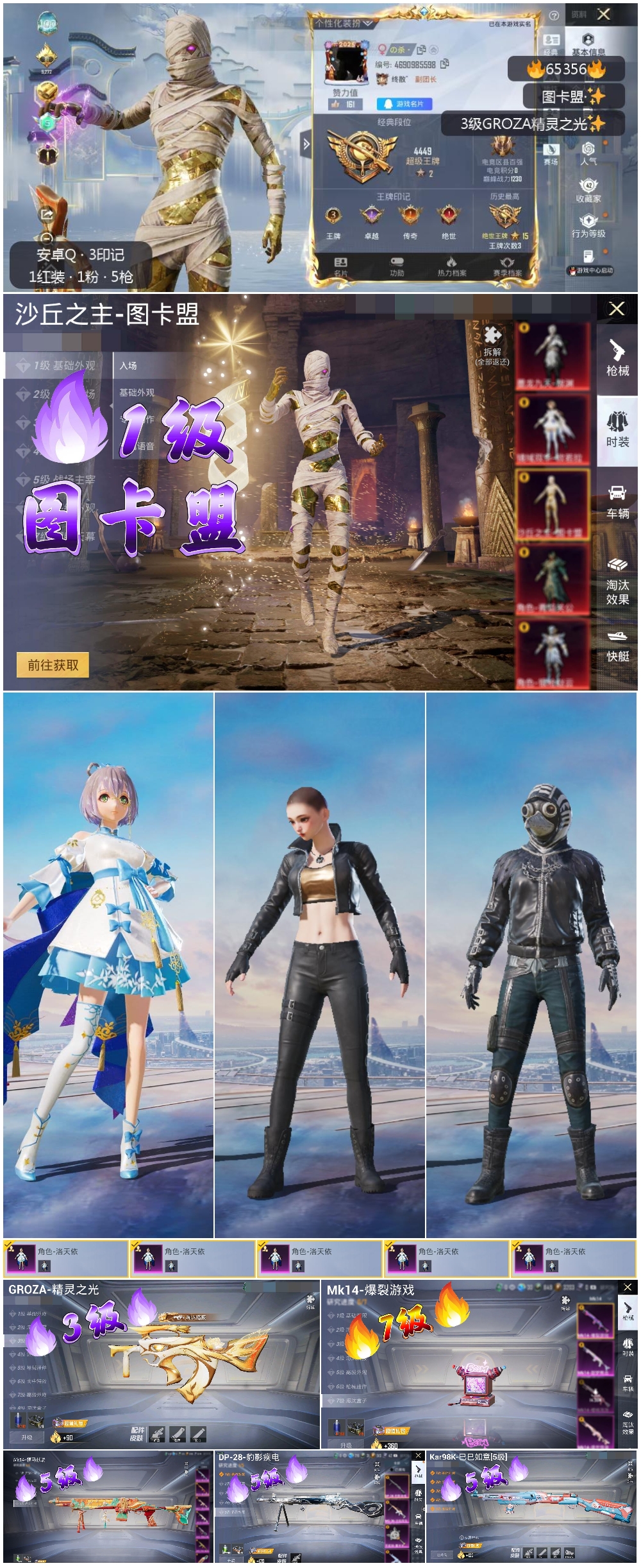 【5特效枪】Kar98K-巳巳如意/5级,Mk14-福马献瑞/5级,GROZA-精灵之光/3级,Mk14-爆裂游戏/7级,DP-28-豹影疾电/5级