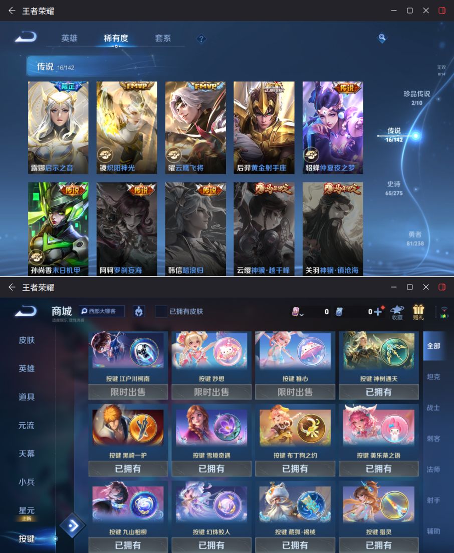【传说皮肤】 神树通天 妄想实况 鸣野蒿 惊梅引 霜月吟 九山相柳 启示之音 幻光神枪 祥瑞亨通 落雪白狼 无双飞将 仲夏夜之梦 黄金射手座 炽阳神光 末日机甲 云鹰飞将
