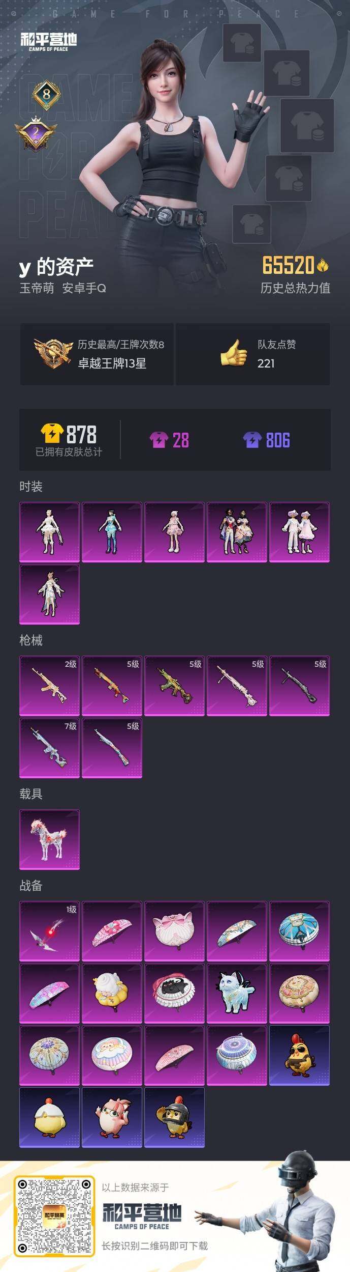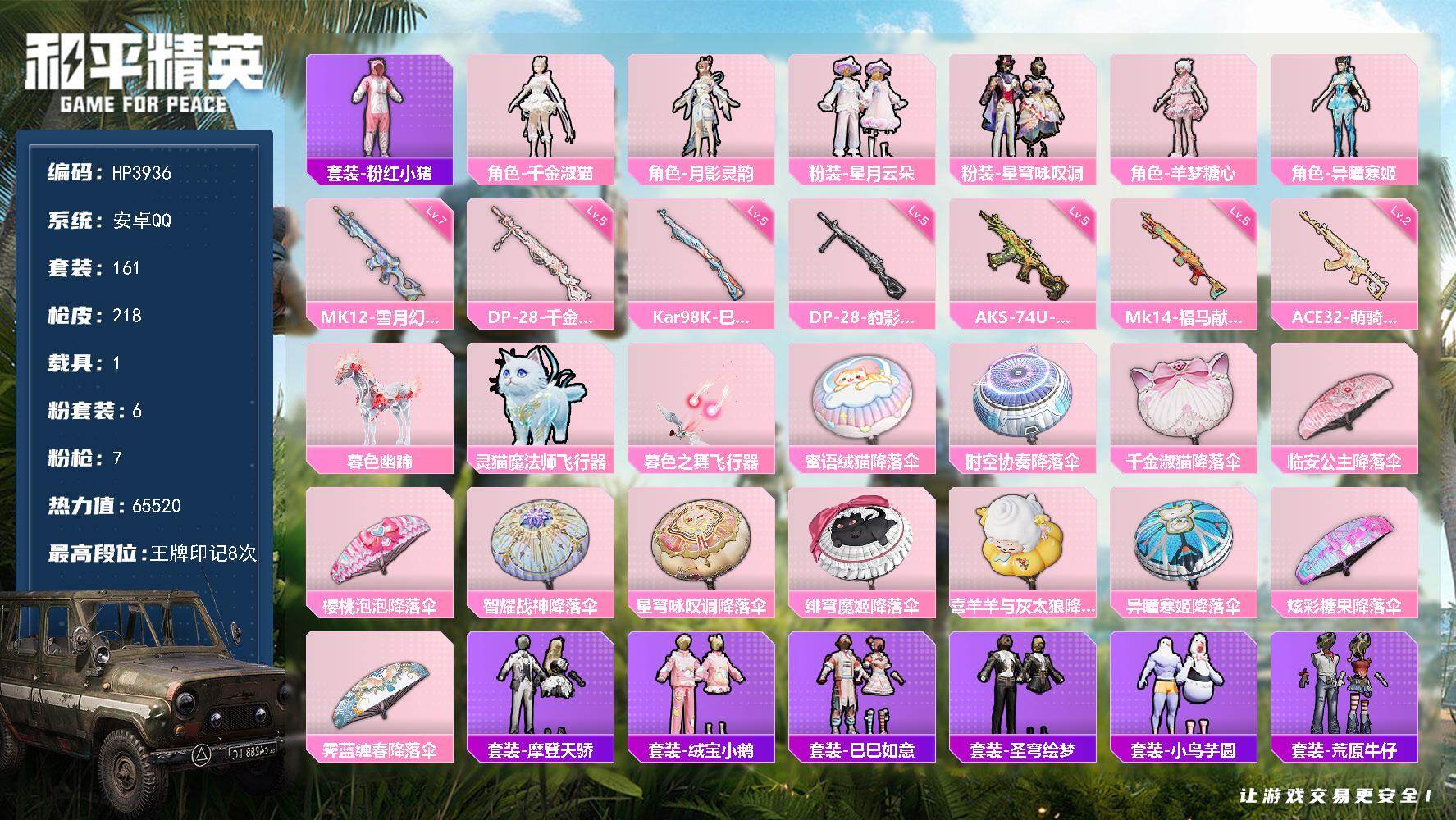 【HP3936】161套装/枪械7/装备311/载具1/战备187/王牌印记8/热力值65520/二级ACE32-萌骑漫游/五级AKS-74U-森灵之息/五级Kar98K-巳巳如意/五级Mk14-福马献瑞/七级MK12-雪月幻音/五级DP-28-千金淑猫/五级DP-28-豹影疾电/套装-粉红小猪/角色-千金淑猫/角色-月影灵韵/粉装-星月云朵/粉装-星穹咏叹调/角色-羊梦糖心/角色-异瞳寒姬/暮色幽蹄/ACE32-萌骑漫游/AKS-74U-森灵之息/Kar98K-巳巳如意/Mk14-福马献瑞/M