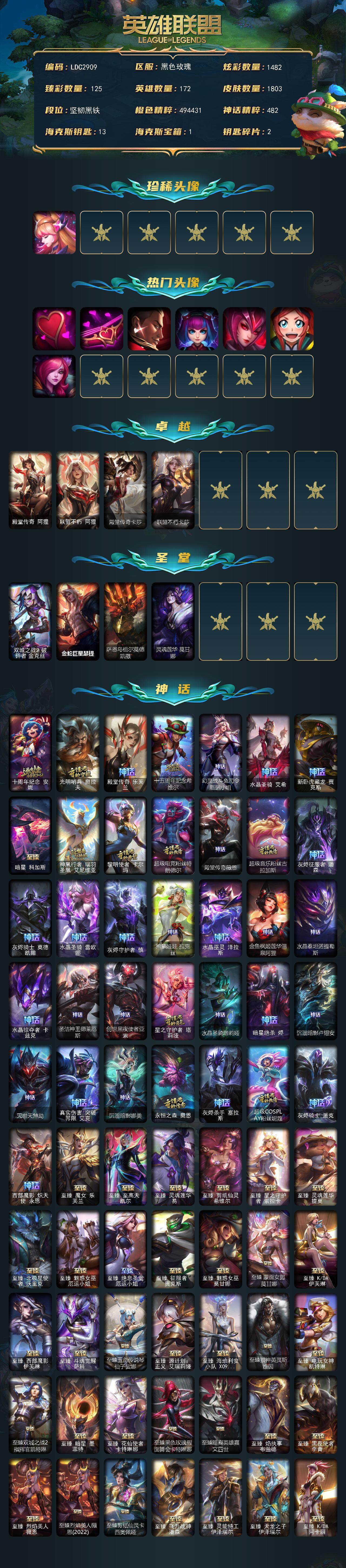 【LDC2909】172英雄/1803皮肤/9终极/153神话/390限定/125臻彩/1482炫彩/134传说/215史诗/未定级账号等级:1615/星守阿狸头像/爱意绵绵头像/爱情之歌头像/觅心游侠卢锡安头像/银河魔装机神安妮头像/勇者阿狸头像/战斗学院拉克丝头像/永恒之森霞头像/殿堂传奇阿狸/联盟不朽阿狸/殿堂传奇卡莎/联盟不朽卡莎/双城之战2破碎者金克丝/金蛇巨星瑟提/萨恩乌祖尔莫德凯撒/灵魂莲华莫甘娜/十周年纪念安妮/光明哨兵奥拉夫/殿堂传奇乐芙兰/十五周年纪念希维尔/幻灵战斗兔司令厄