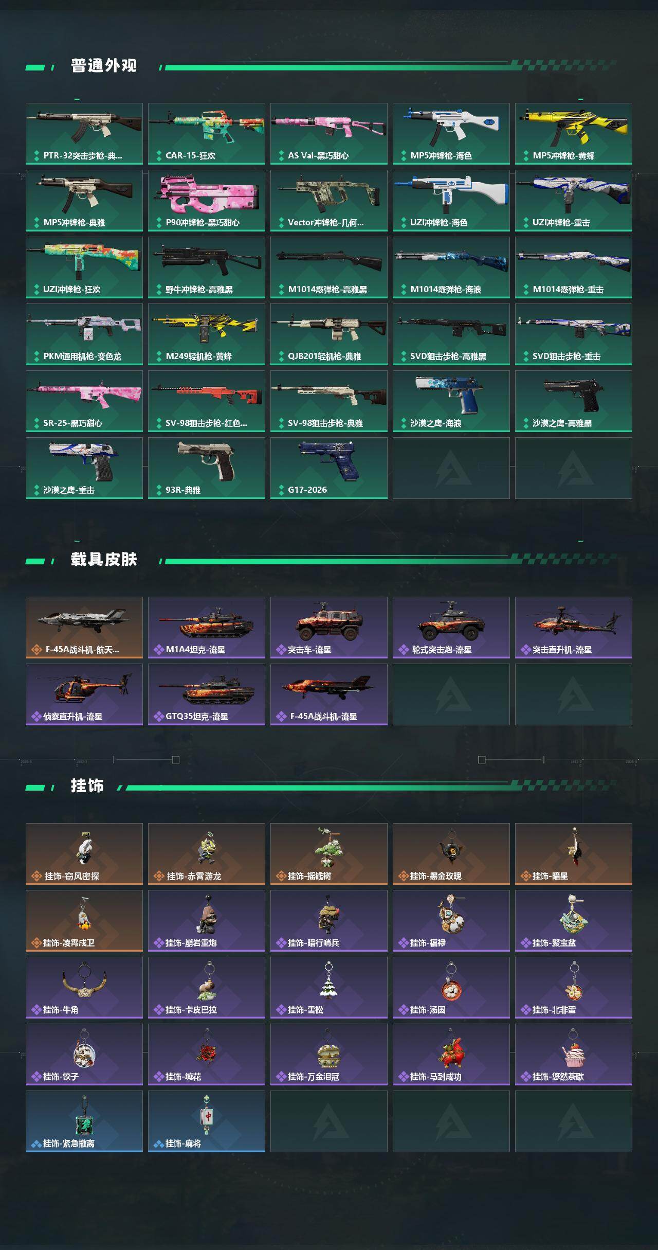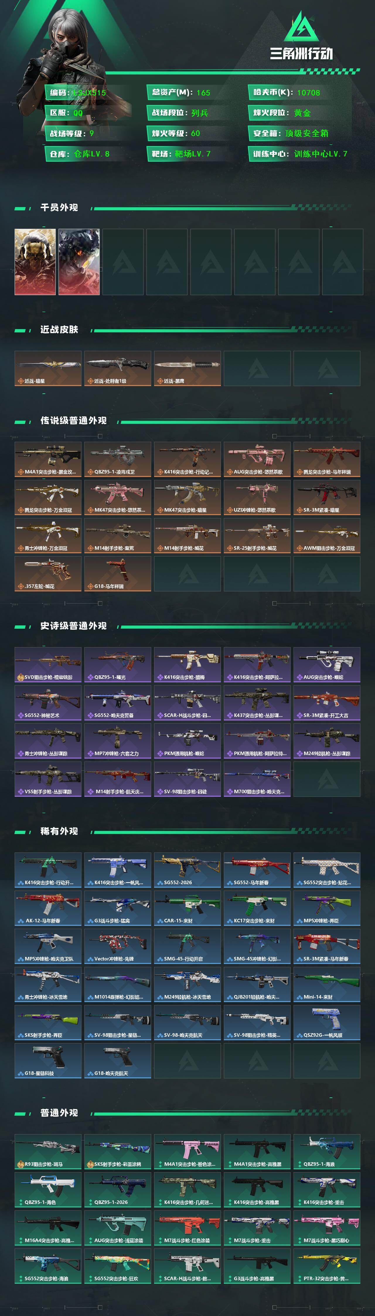 165m总资产-10708k哈夫币-60烽火等级-黄金-9战场等级-列兵【干员外观】:红狼-蚀金玫瑰,威龙-凌霄戍卫【近战皮肤】:近战-暗星,近战-处刑者1级,近战-黑鹰【传说外观】:M4A1突击步枪-蚀金玫瑰,QBZ95-1突击步枪-凌霄戍卫,K416突击步枪-行动记录,AUG突击步枪-悠然茶歇,腾龙突击步枪-马年祥瑞,腾龙突击步枪-万金泪冠,MK47突击步枪-悠然茶歇,MK47突击步枪-暗星,UZI冲锋枪-悠然茶歇,SR-3M紧凑突击步枪-暗星,勇士冲锋枪-万金泪冠,M14射手步枪-蛮荒,M