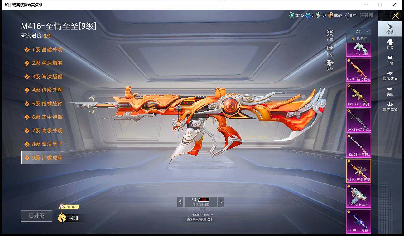 【粉色枪皮等级】:SCAR-L-青春物语(四级),M416-至情至圣(九级),ACE32-萌骑漫游(二级),UZI-筑梦精灵(五级),UMP45-萌骑冒险(二级),AKS-74U-森灵之息(五级),Kar98K-巳巳如意(一