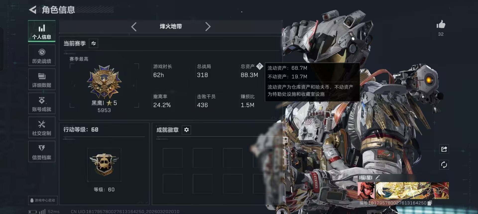 88m总资产-178k哈夫币-60烽火等级-黑鹰-11战场等级-列兵