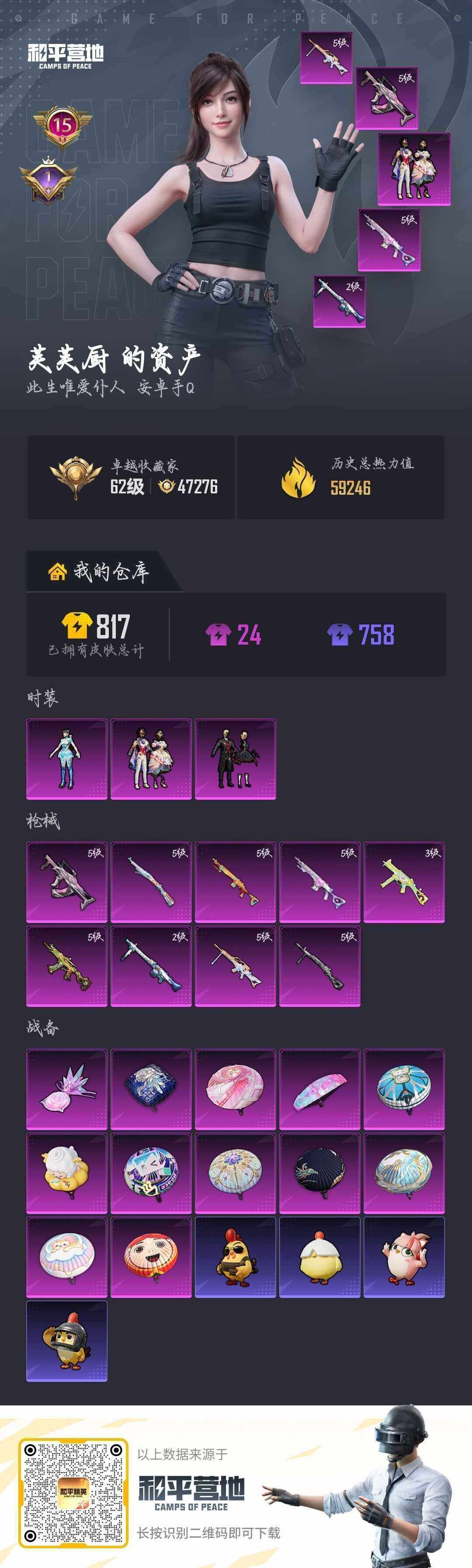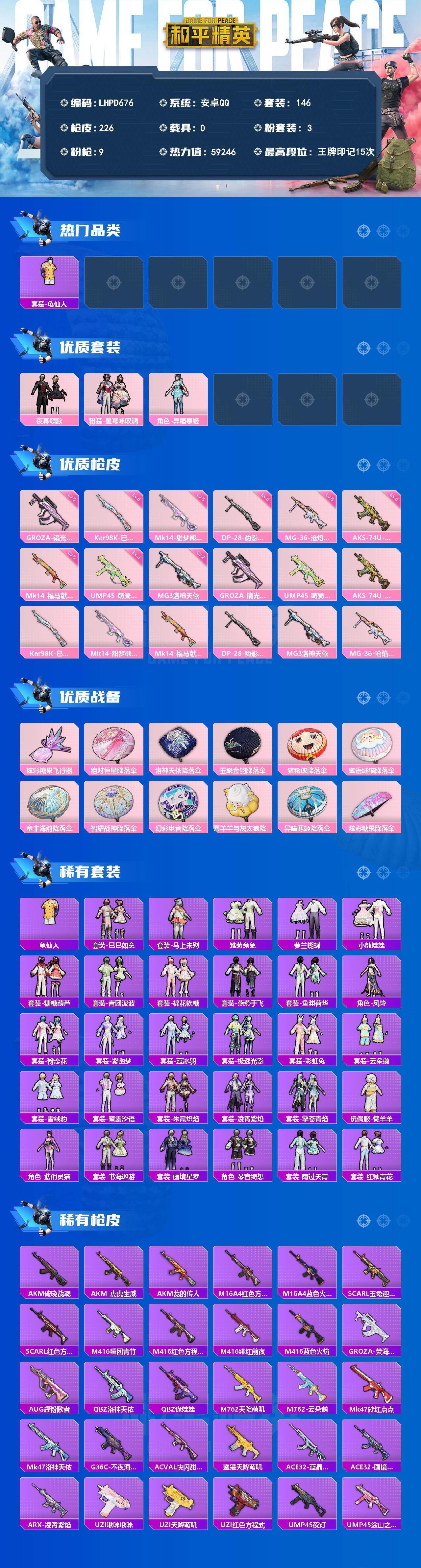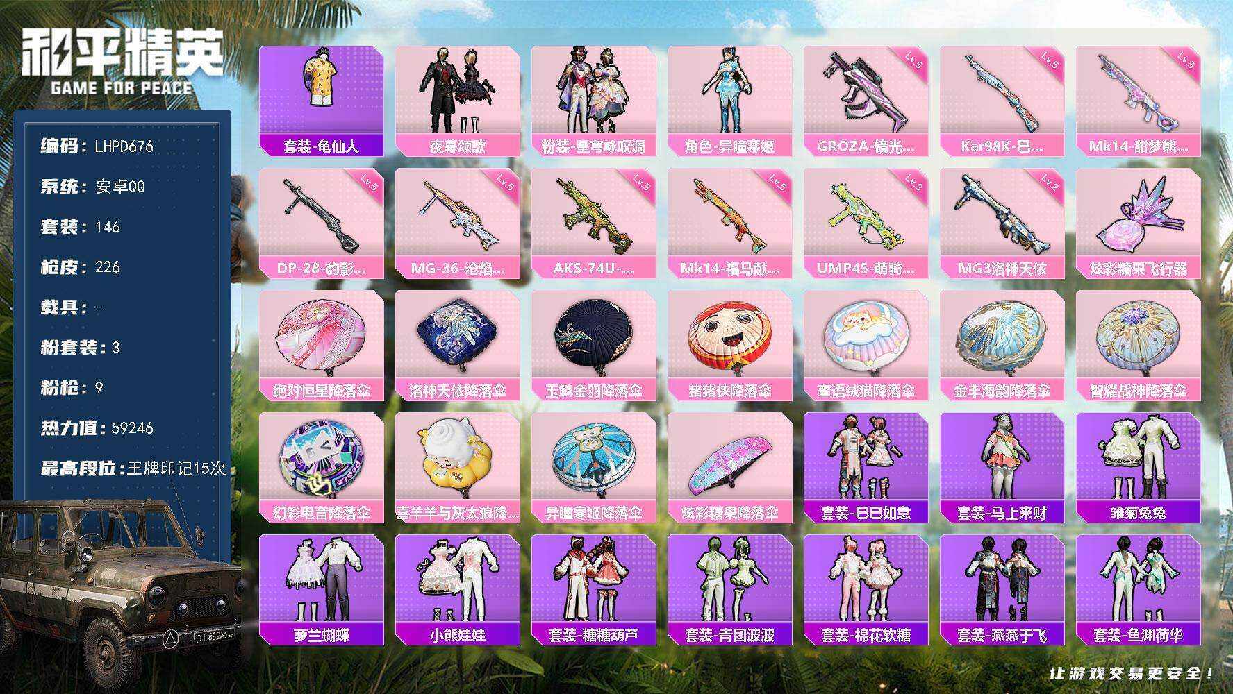 【店主推荐捡漏号!可直接换绑】安卓 手Q-3粉装-9特效枪-0载具-1粉色飞行器-59246热力值-15王牌印记-146套装-226枪皮【热门品类】:套装-龟仙人【粉色套装】:粉装-夜幕颂歌,粉装-星穹咏叹调,角色-异瞳寒姬【粉色枪皮等级】:GROZA-镜光银凌(五级),UMP45-萌骑冒险(三级),AKS-74U-森灵之息(五级),Kar98K-巳巳如意(五级),Mk14-甜梦熊击(五级),M