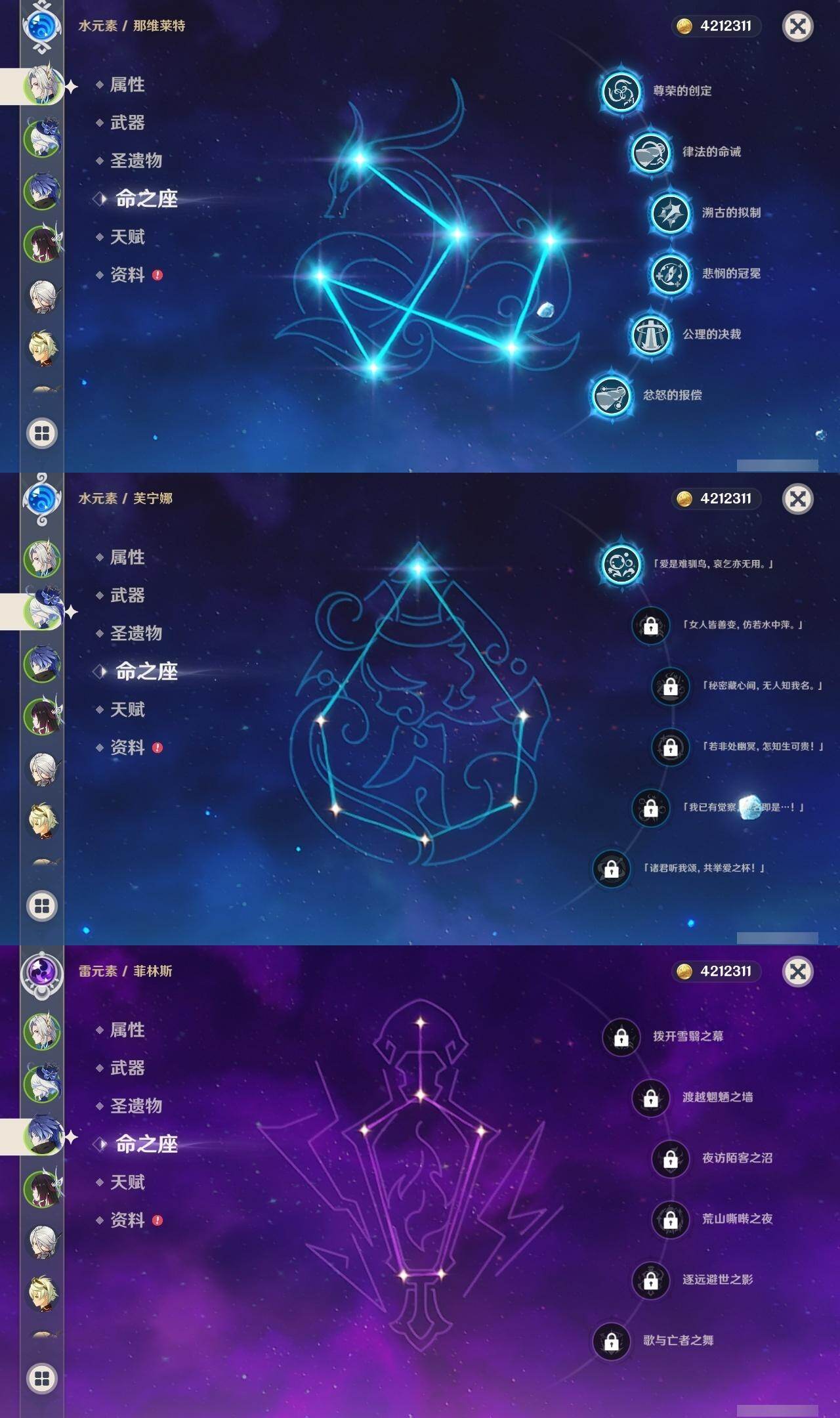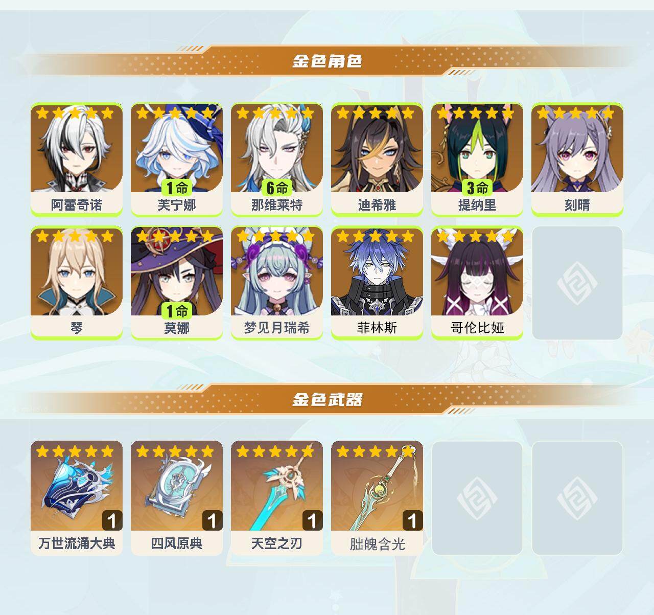 0命阿蕾奇诺,1命芙宁娜,满命那维莱特,0命迪希雅,3命提纳里,0命刻晴,0命琴,1命莫娜,0命梦见月瑞希,0命菲林斯,0命哥伦比娅,精1万世流涌大典,精1四风原典,精1天空之刃,精1朏魄含光