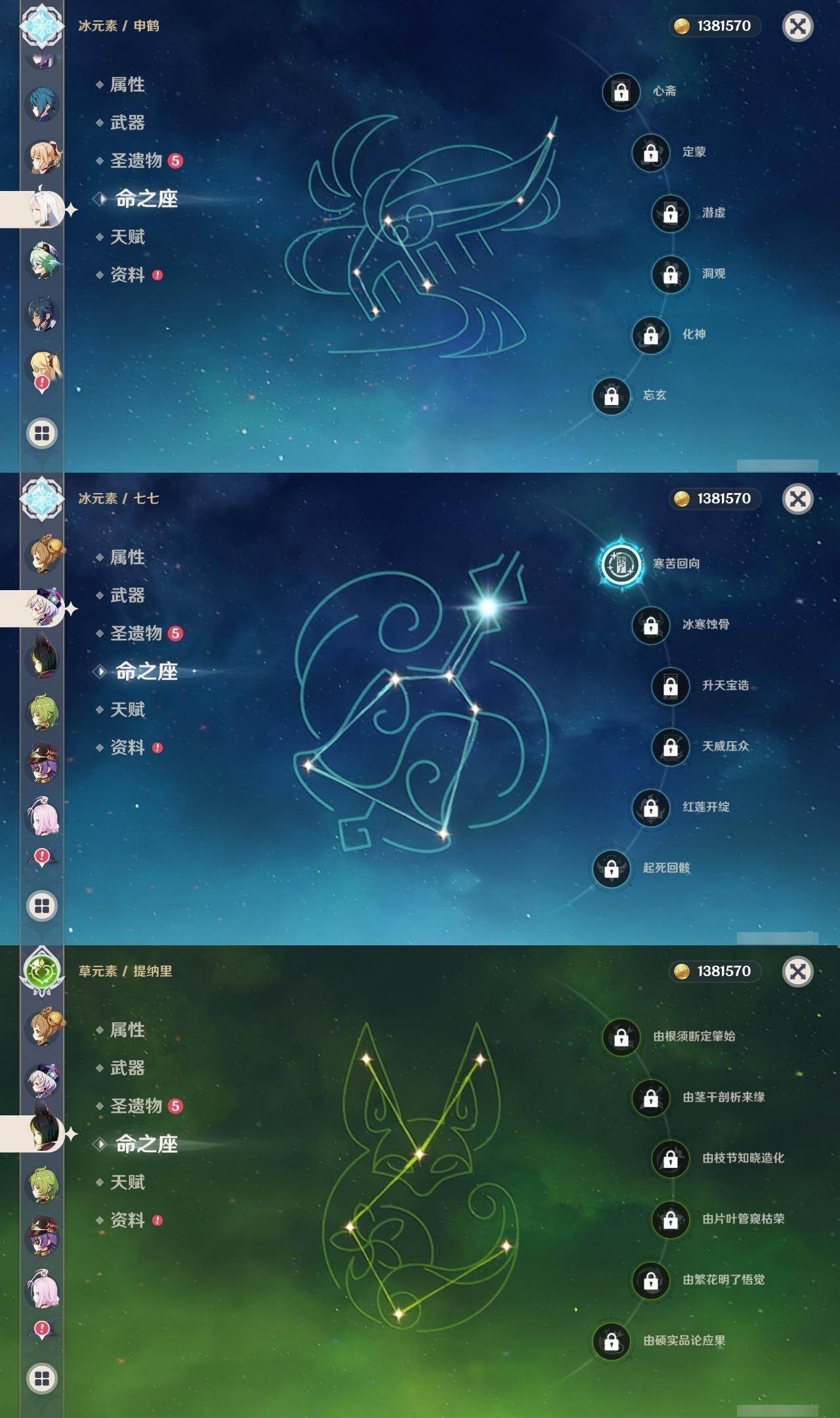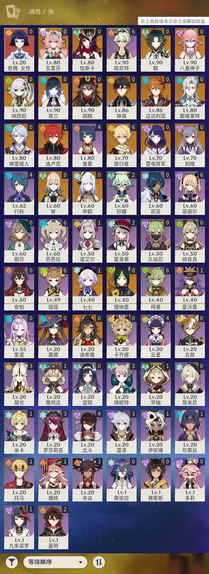 0命那维莱特,0命迪希雅,0命纳西妲,0命提纳里,0命夜兰,0命神里绫人,0命八重神子,0命申鹤,0命雷电将军,0命钟离,0命胡桃,0命魈,0命达达利亚,0命刻晴,1命七七,0命琴,0命莫娜,1命迪卢克,0命恰斯卡,0命瓦雷莎,精1天空之脊,精1阿莫斯之弓