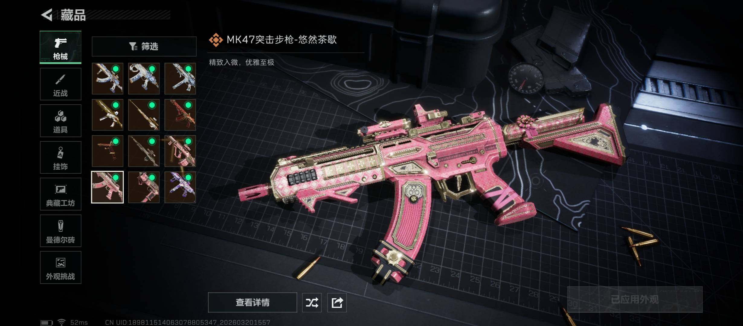 【传说外观】:AKM突击步枪-锦绣,AUG突击步枪-悠然茶歇,腾龙突击步枪-马年祥瑞,K437突击步枪-锦绣,MK47突击步枪-悠然茶歇,UZI冲锋枪-悠然茶歇,SMG-45冲锋枪-锦绣,勇士冲锋枪-万金泪冠,QCQ171冲锋枪-不羁人生,M14射手步枪-蛮荒,AWM狙击步枪-万金泪冠,G18-马