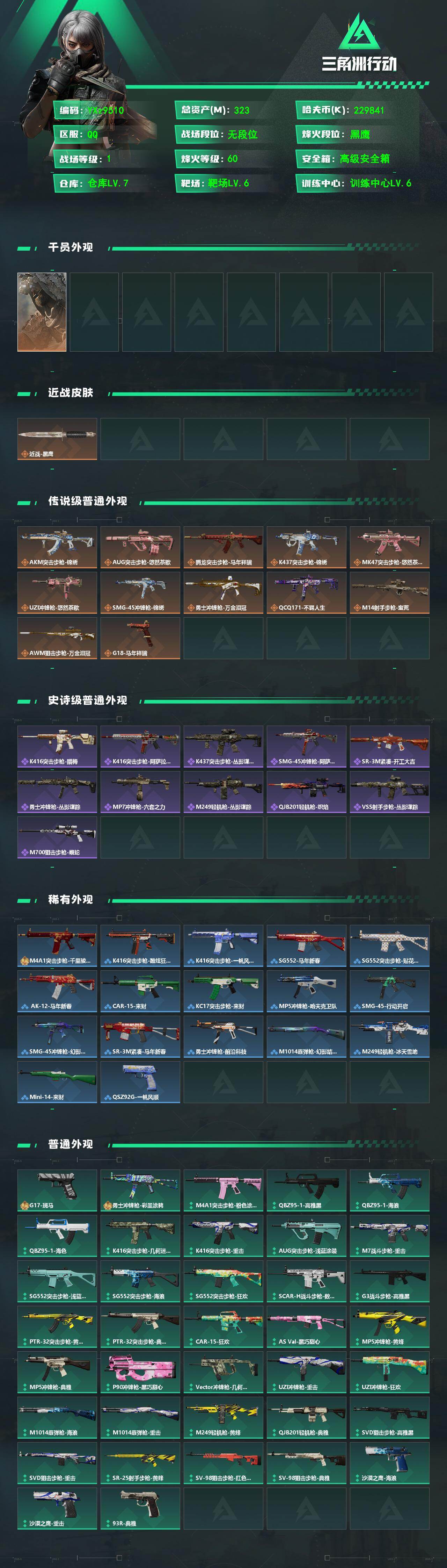 【Q区三端互通】【【无二协助处理】】YXz9510-特勤处:仓库7级/靶场6级/训练中心6级-总资产323m-哈夫币229m-烽火等级:60级