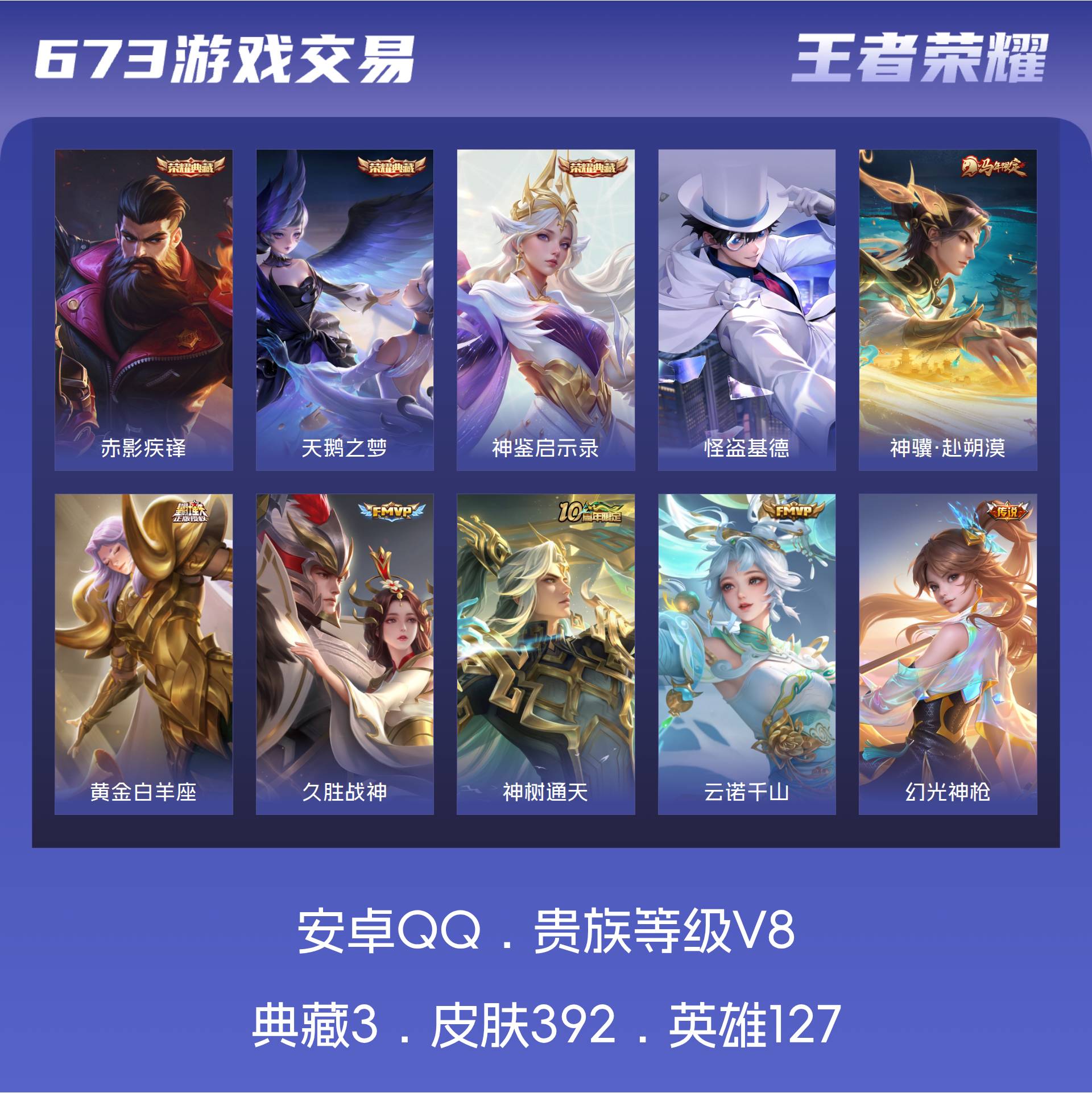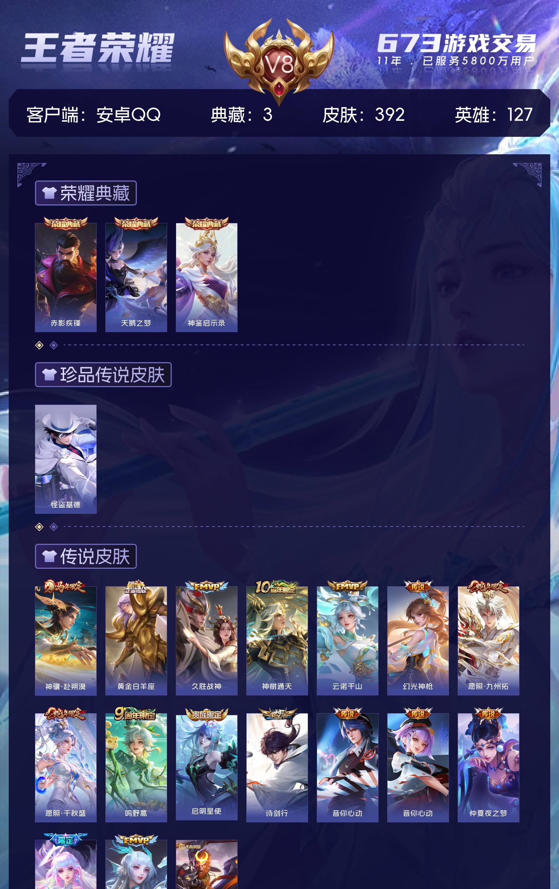 安卓QQ/非凡王者/392皮肤/127英雄/3典藏/0珍品无双/0无双/1珍品传说/16传说/122