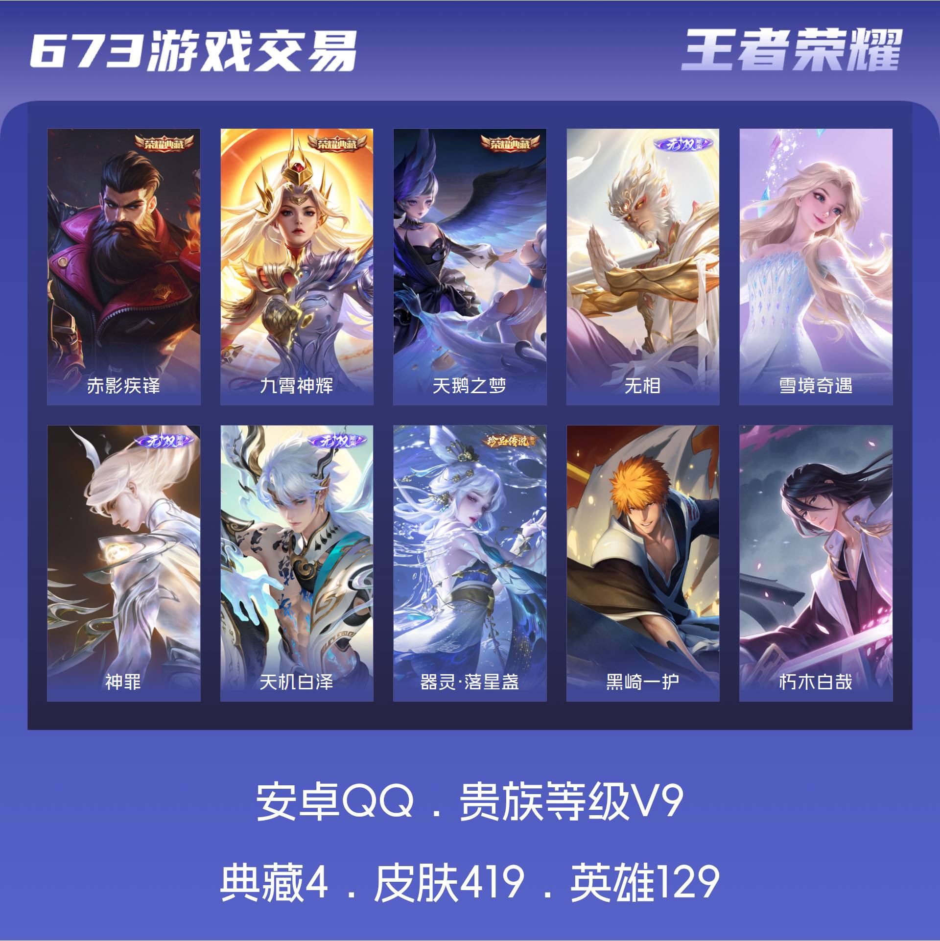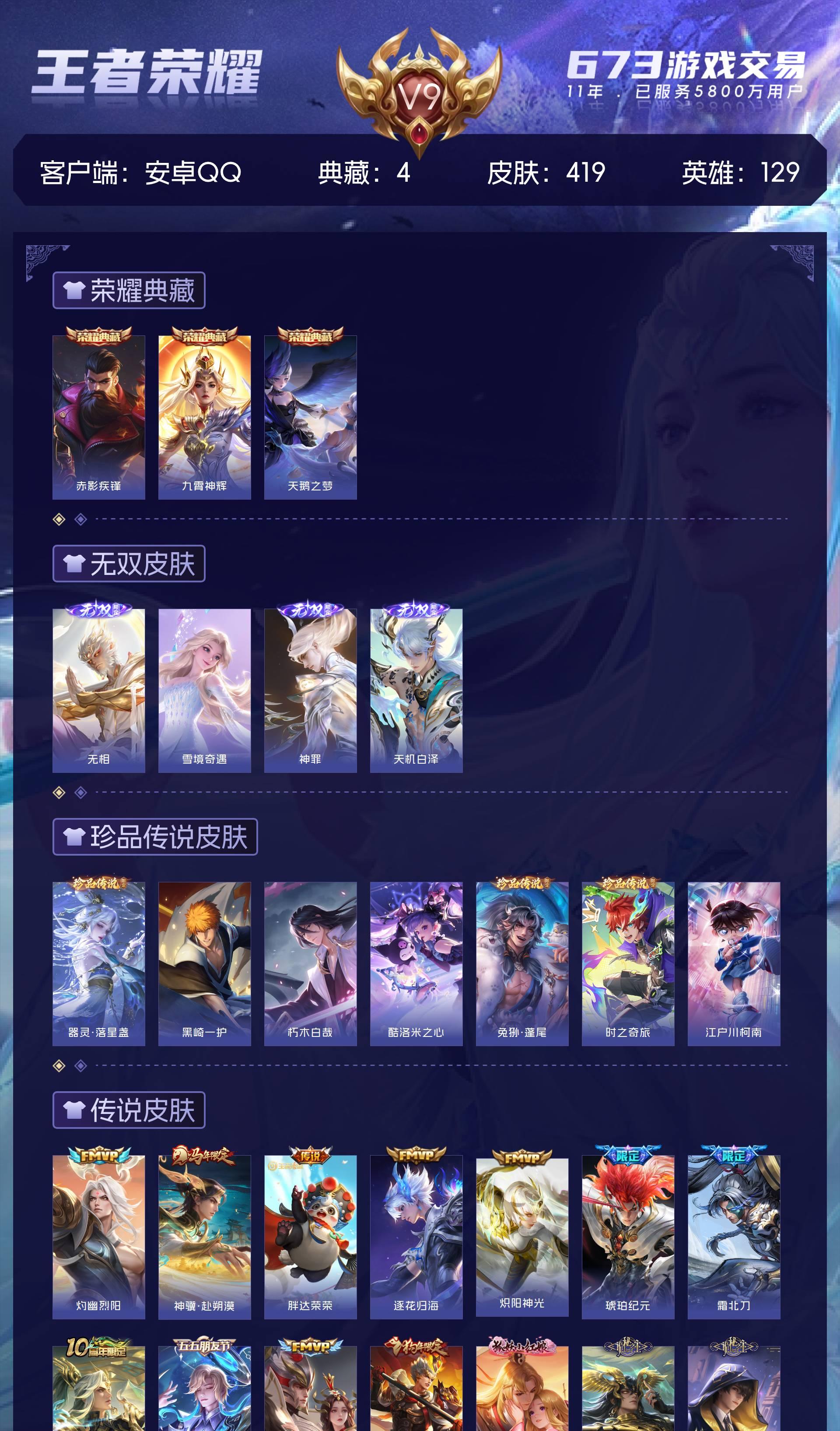 安卓QQ/永恒钻石/419皮肤/129英雄/3典藏/0珍品无双/4无双/7珍品传说/29传说/130