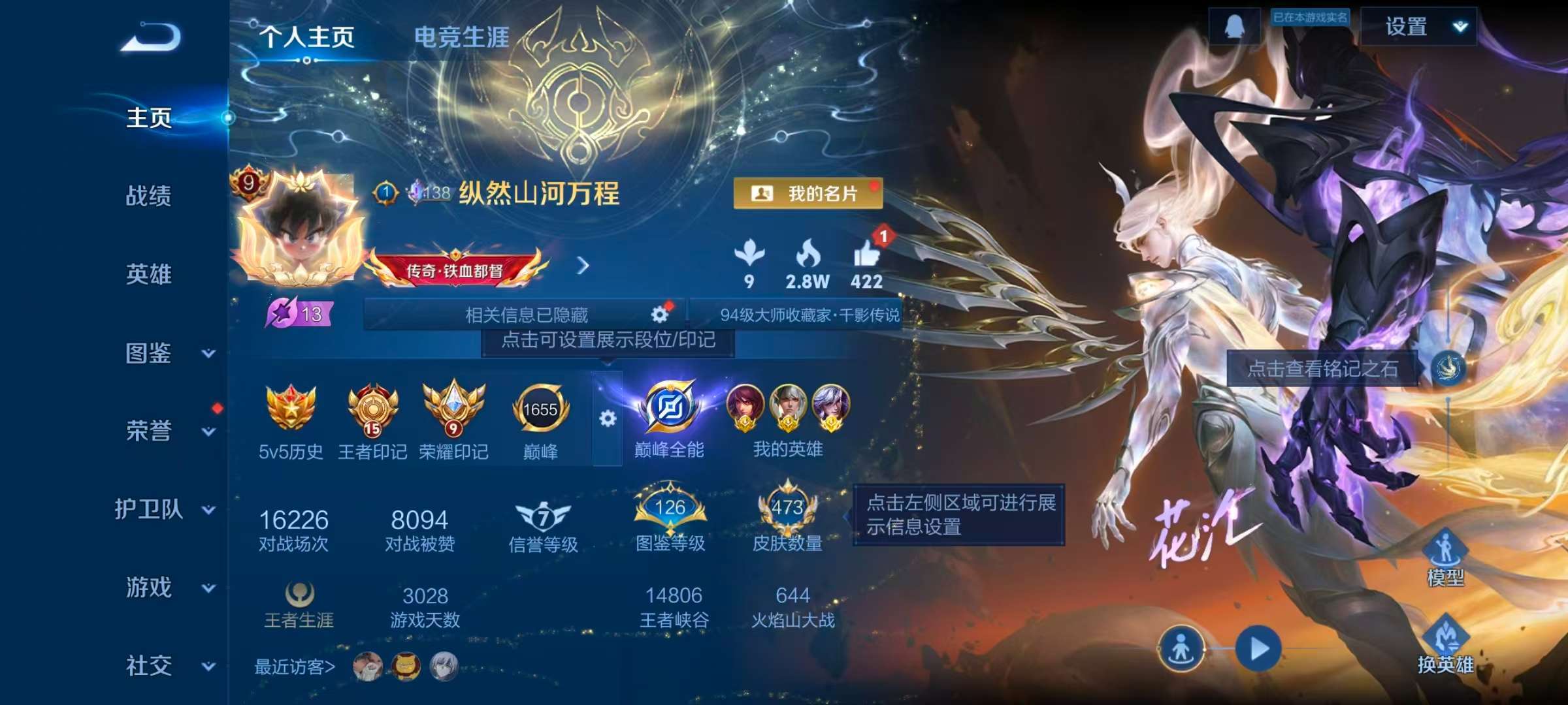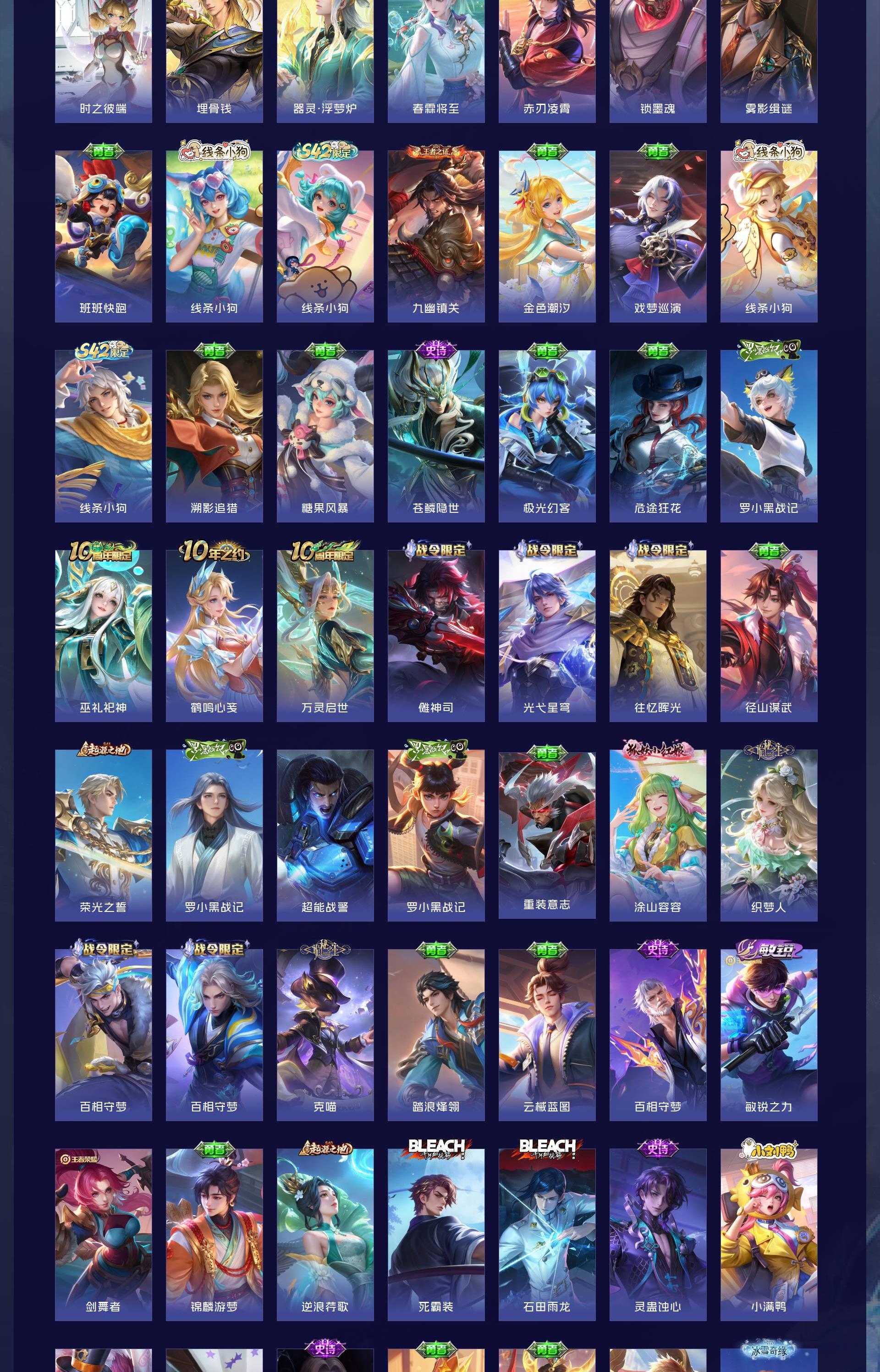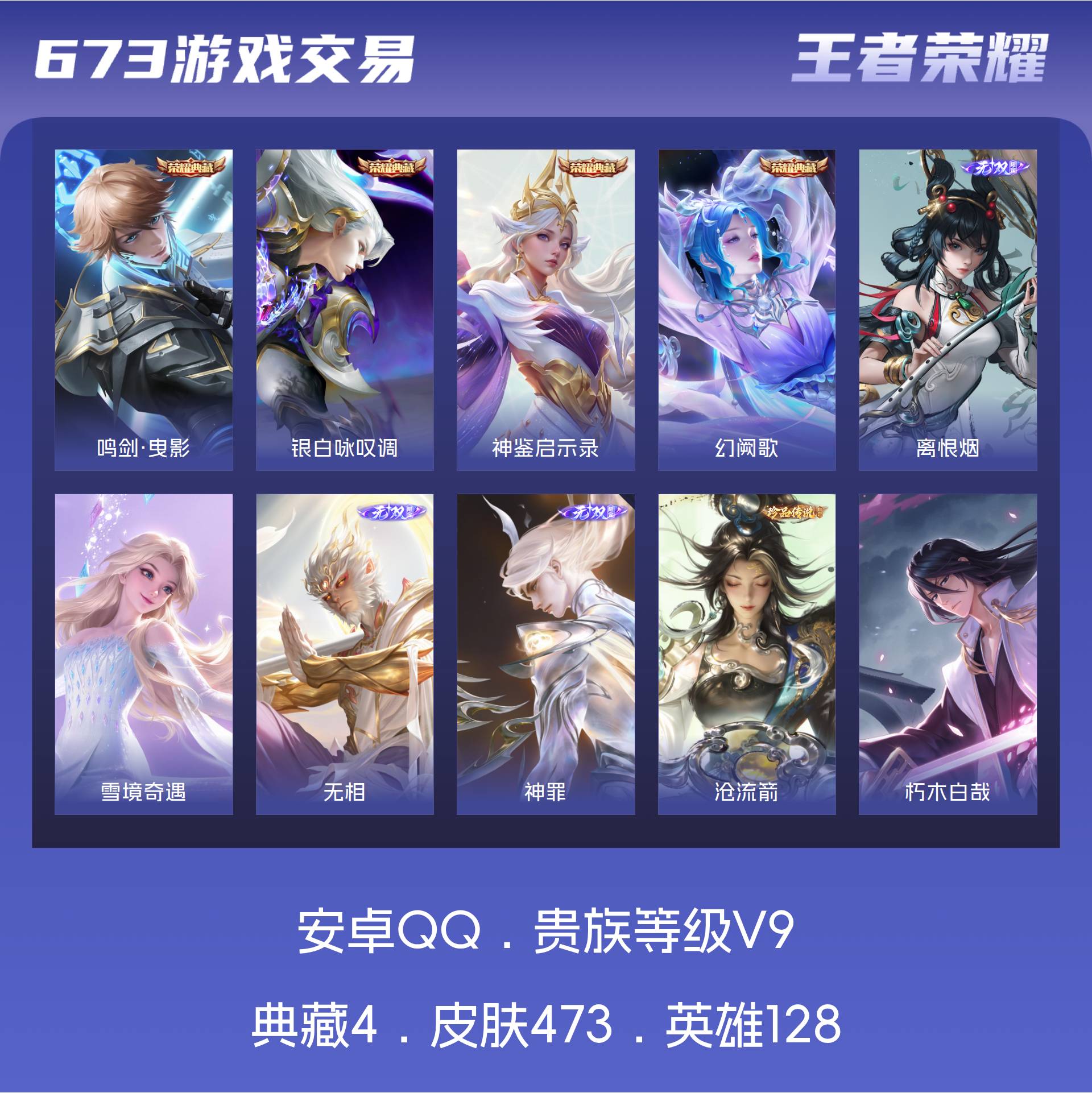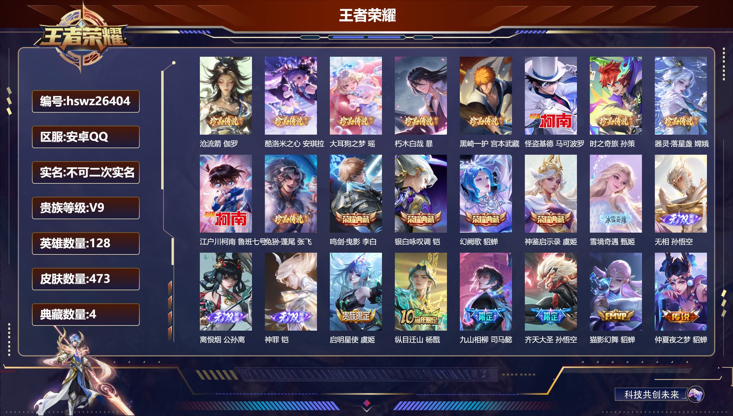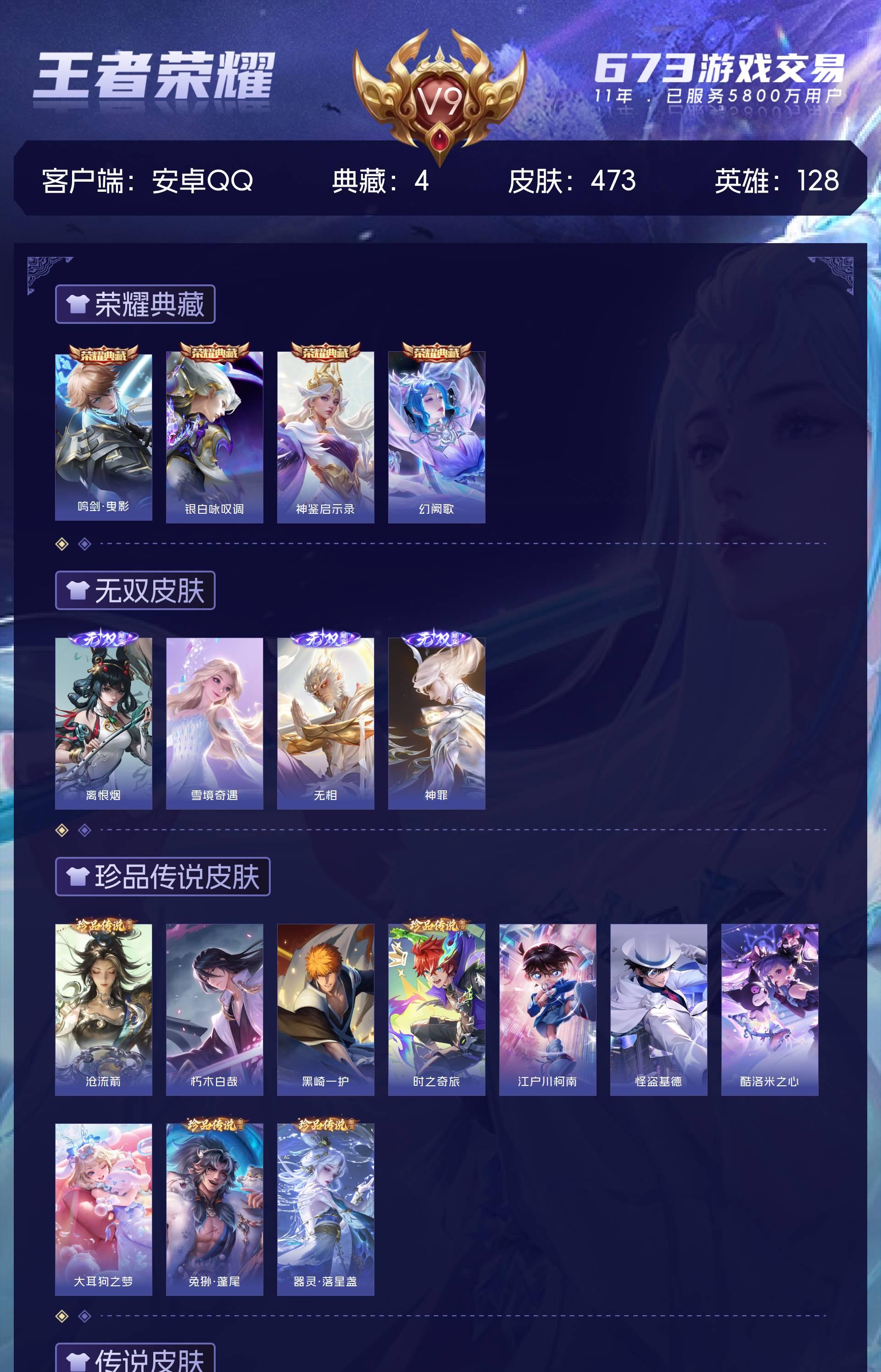安卓QQ/传奇王者/473皮肤/128英雄/4典藏/0珍品无双/4无双/10珍品传说/38传说/13