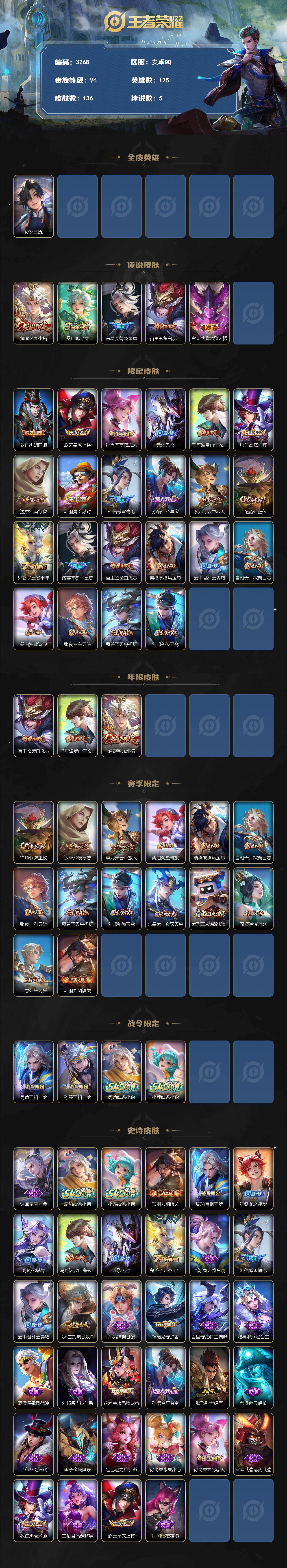 安卓Q-V6-最强王者段位-125英雄-136皮肤-5传说-33史诗