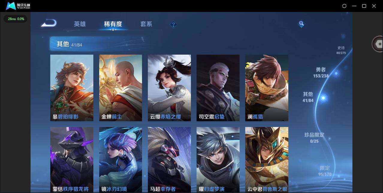 贵族等级: V7 英雄数: 127 皮肤数: 284 荣耀水晶: 全息碎影 星