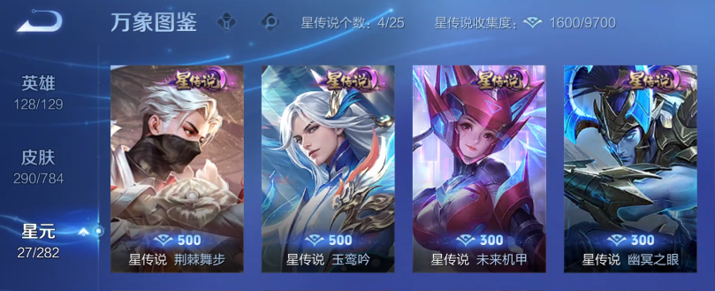 皮肤数290无双皮肤数3传说皮肤数41珍品传说皮数2星传说皮