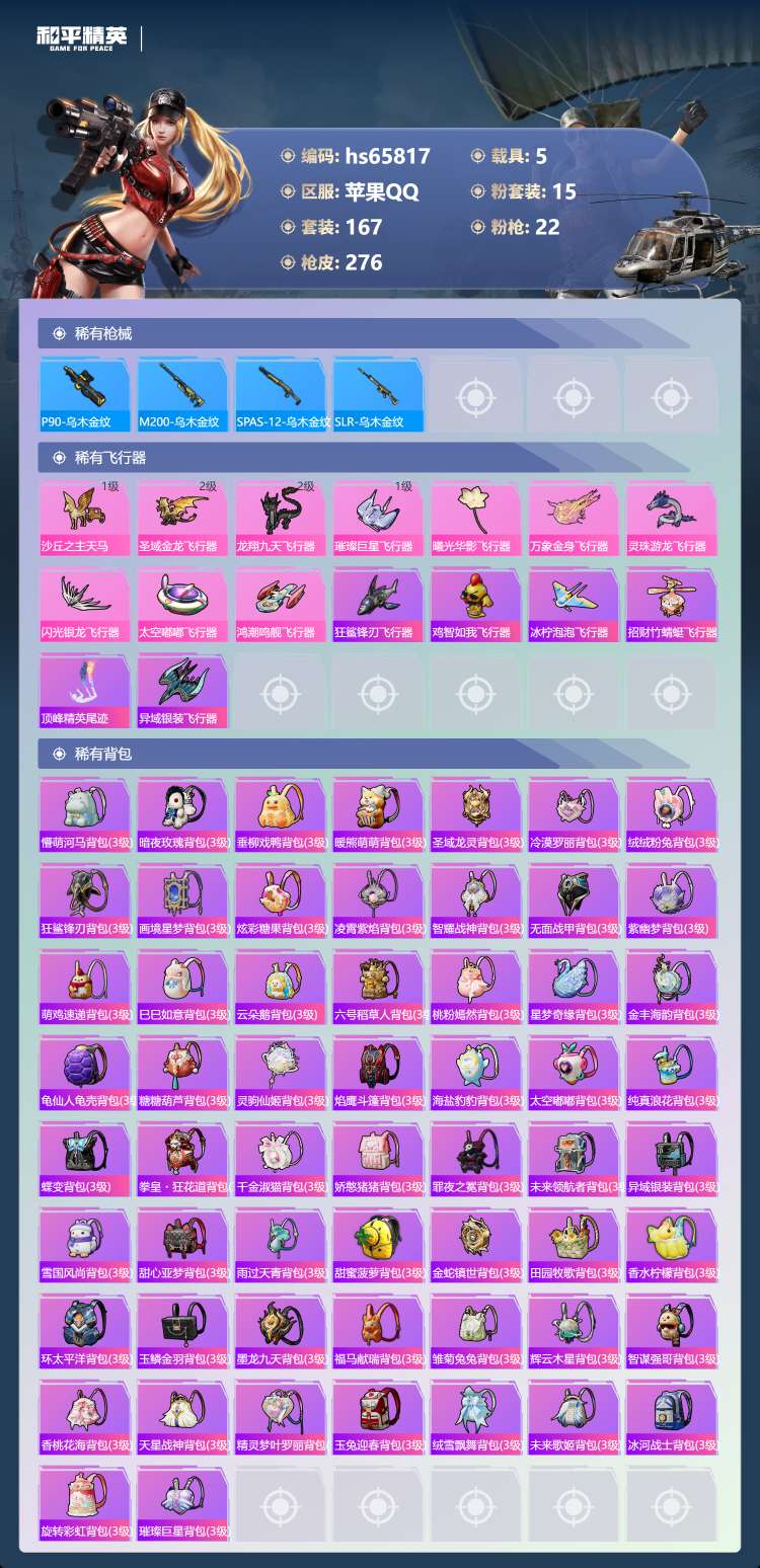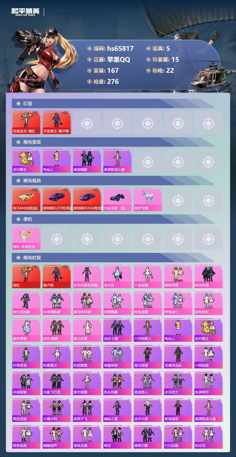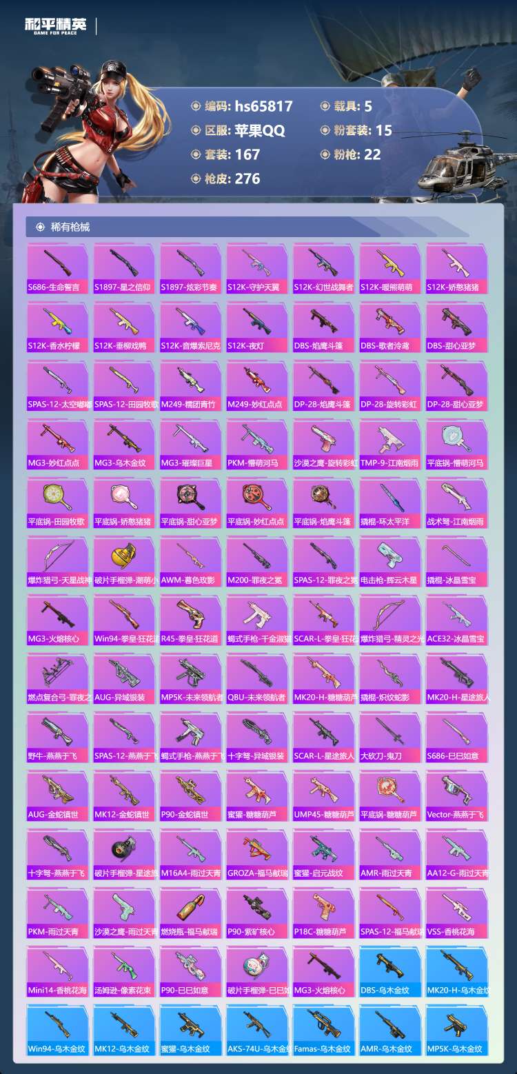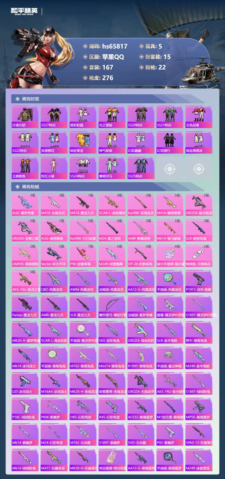 hs65753 苹果手Q-14王牌印记-5粉装-10特效枪-2载具-87766热力值-242套装-2