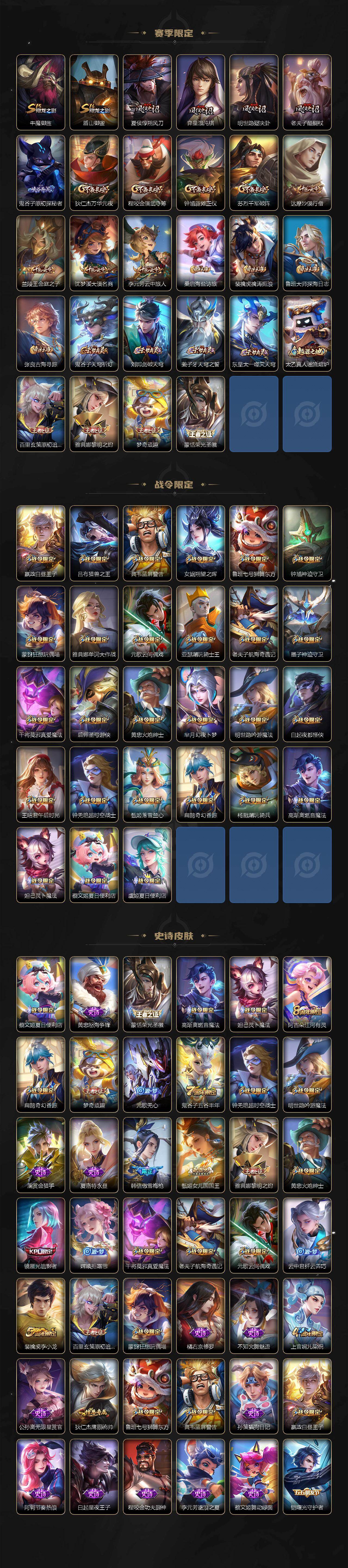 【限定皮肤】:白起狰,蔡文姬夏日便利店,大乔绒语心约,虞姬夏日便利店,姜子牙天穹之誓,狄仁杰阴阳师,赵云皇家上将,墨子神迹守