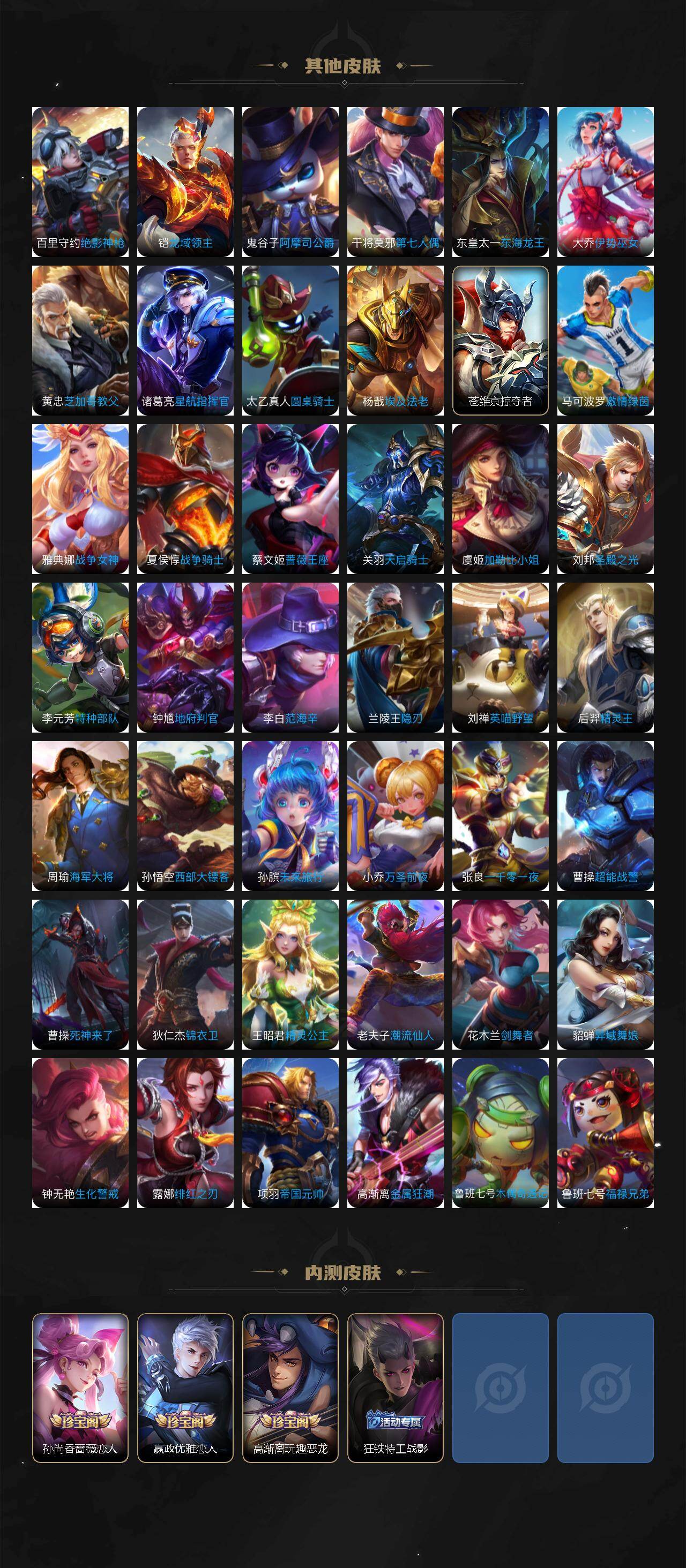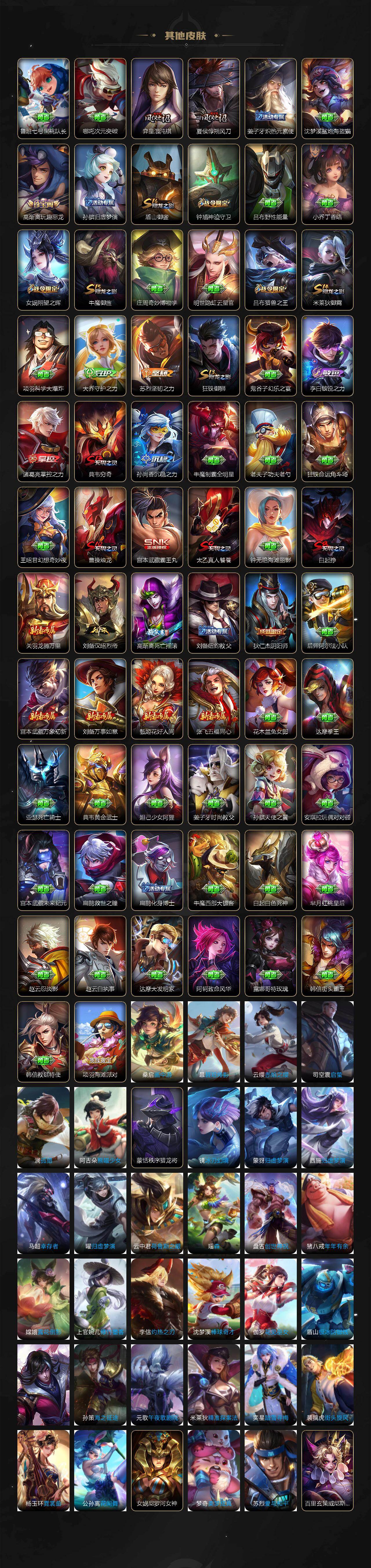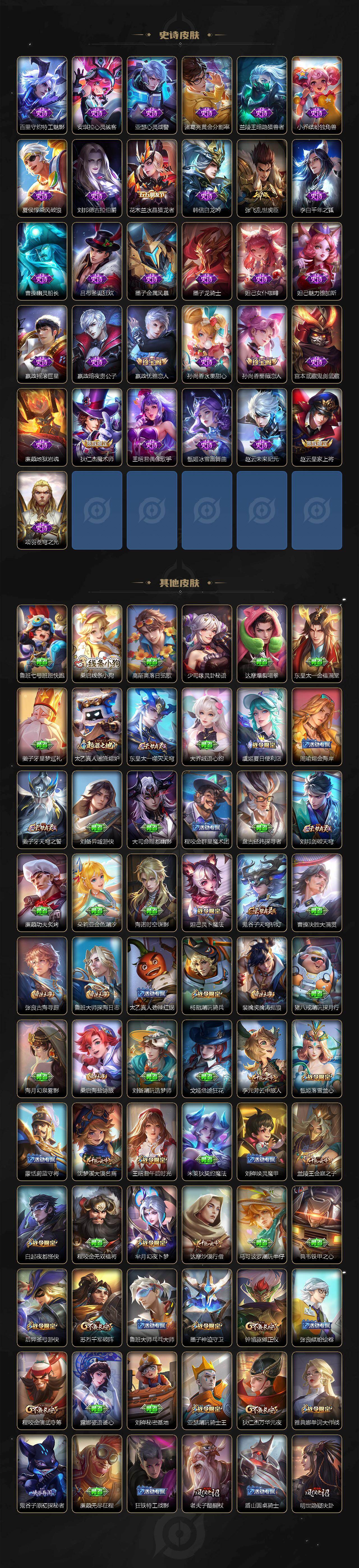 【传说皮肤】:桑启鸣野蒿,李信一念神魔,干将莫邪久胜战神,梦奇胖达荣荣,貂蝉仲夏夜之梦,孙悟空地狱火,狄仁杰超时空战士