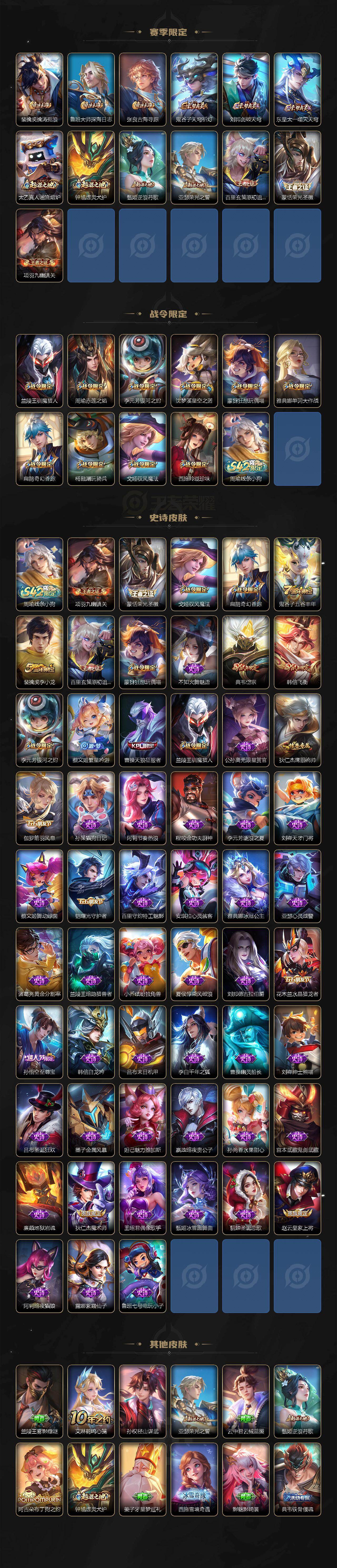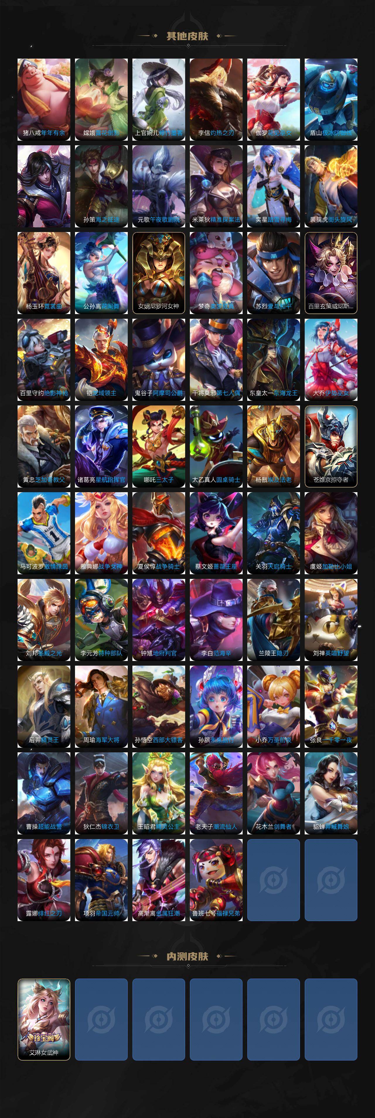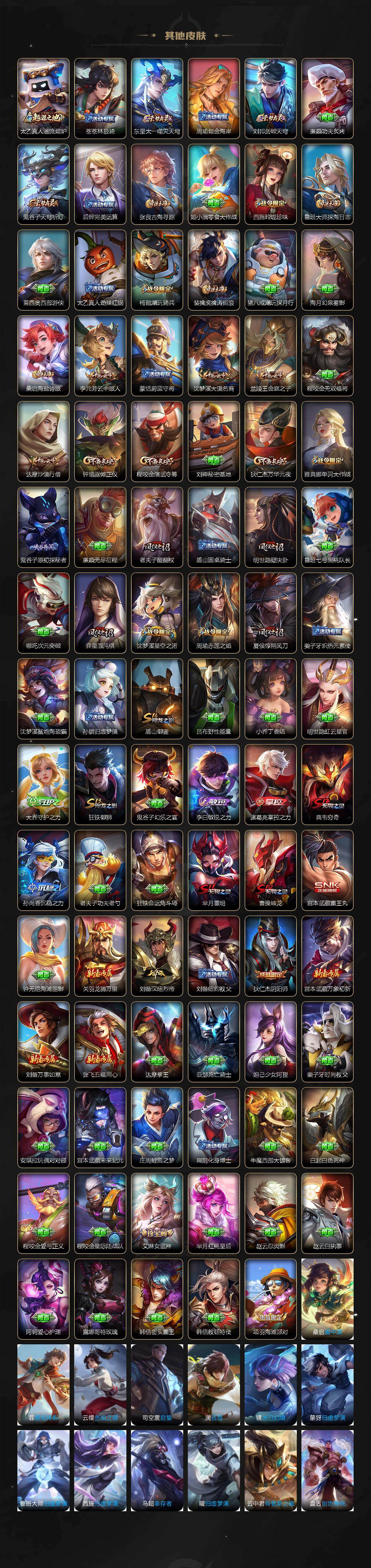 【传说皮肤】:虞姬启明星使,干将莫邪久胜战神,虞姬云霓雀翎,达摩黄金狮子座,花木兰冠军飞将,后羿黄金射手座,貂蝉仲夏夜之梦,李白凤求凰,孙尚香末日机甲,宫本武藏地狱