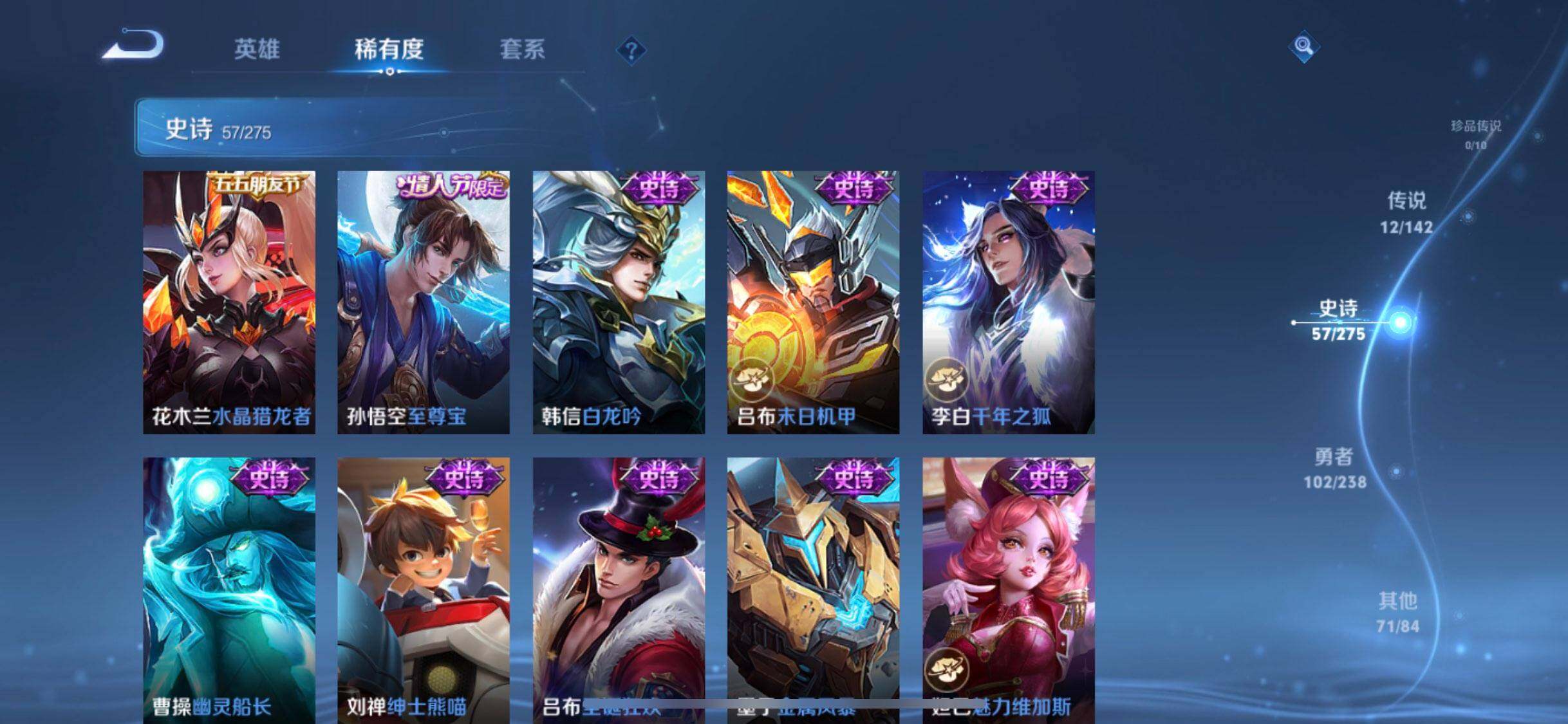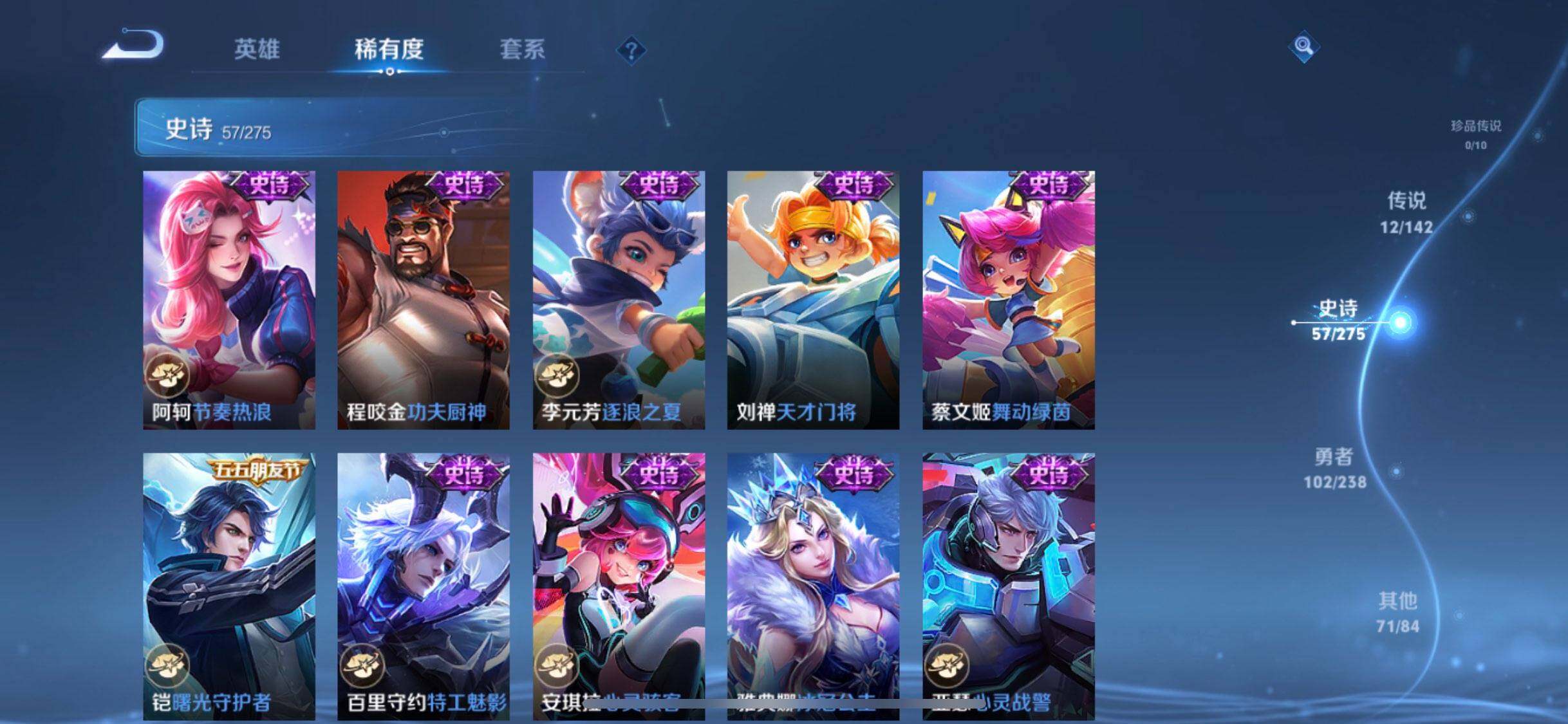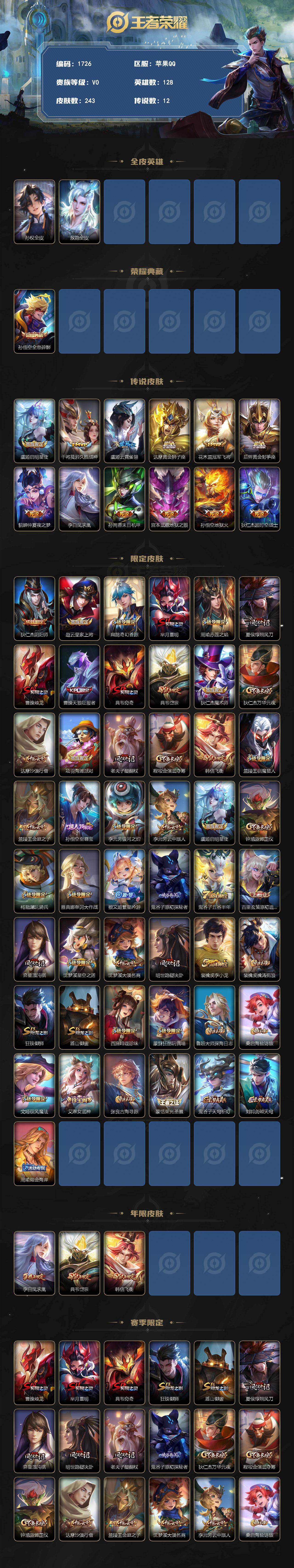 【传说皮肤】:虞姬启明星使,干将莫邪久胜战神,虞姬云霓雀翎,达摩黄金狮子座,花木兰冠军飞将,后羿黄金射手座,貂蝉仲夏夜之梦,李白凤求凰,孙尚香末日机甲,宫本武藏地狱