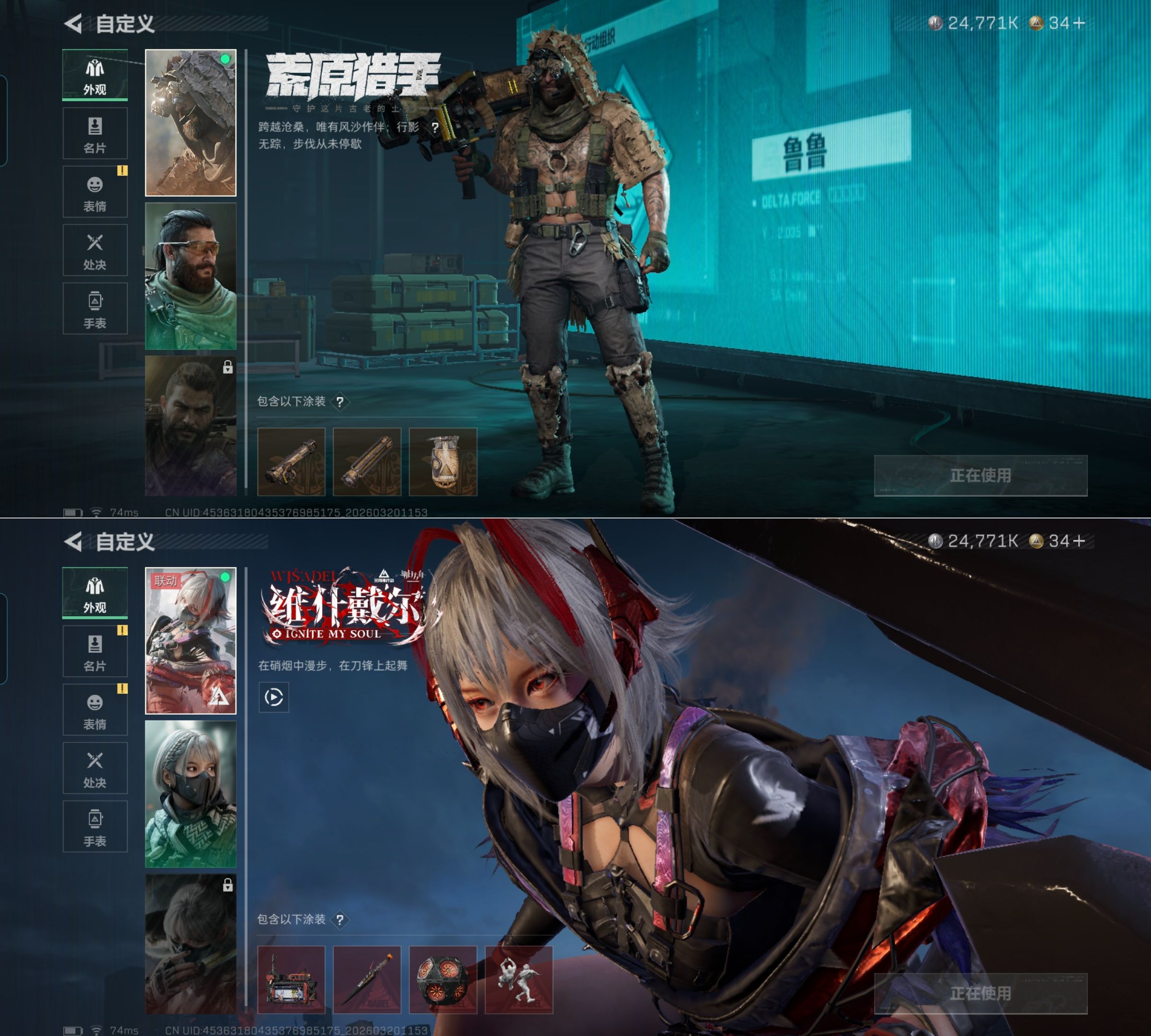 MSJ3880【5干员威龙-凌霄戍卫 骇爪-维什戴尔 双刀处刑者 暗星】无二次包 三端互通-总价值82.3M-哈夫币24771k-烽火地带等级60烽火地带段位三角洲巅峰【干员皮肤】露娜-金牌射手 红狼-电锯惊魂 乌鲁鲁-荒原猎手 威龙-凌霄戍卫 骇爪-维什戴尔【近战武器】黑鹰 处刑者 暗星【枪皮】AS Val突击步枪-猛兽 M16A4突击步枪-斑马 M4A1突击步枪-隐秘行动 M4A1突击步枪-高雅黑 M4A1突击步枪-海色 M4A1突击步枪-繁盛 AKM突击步枪-肃杀 QBZ95-1突击步枪-
