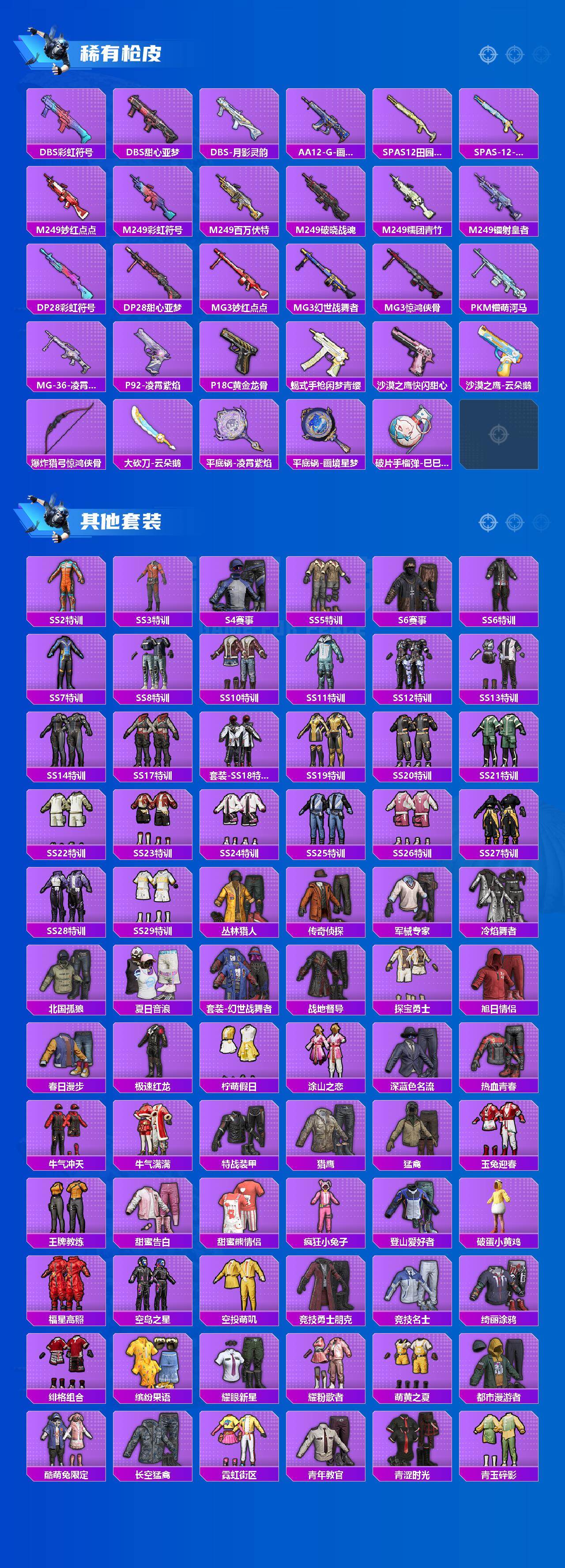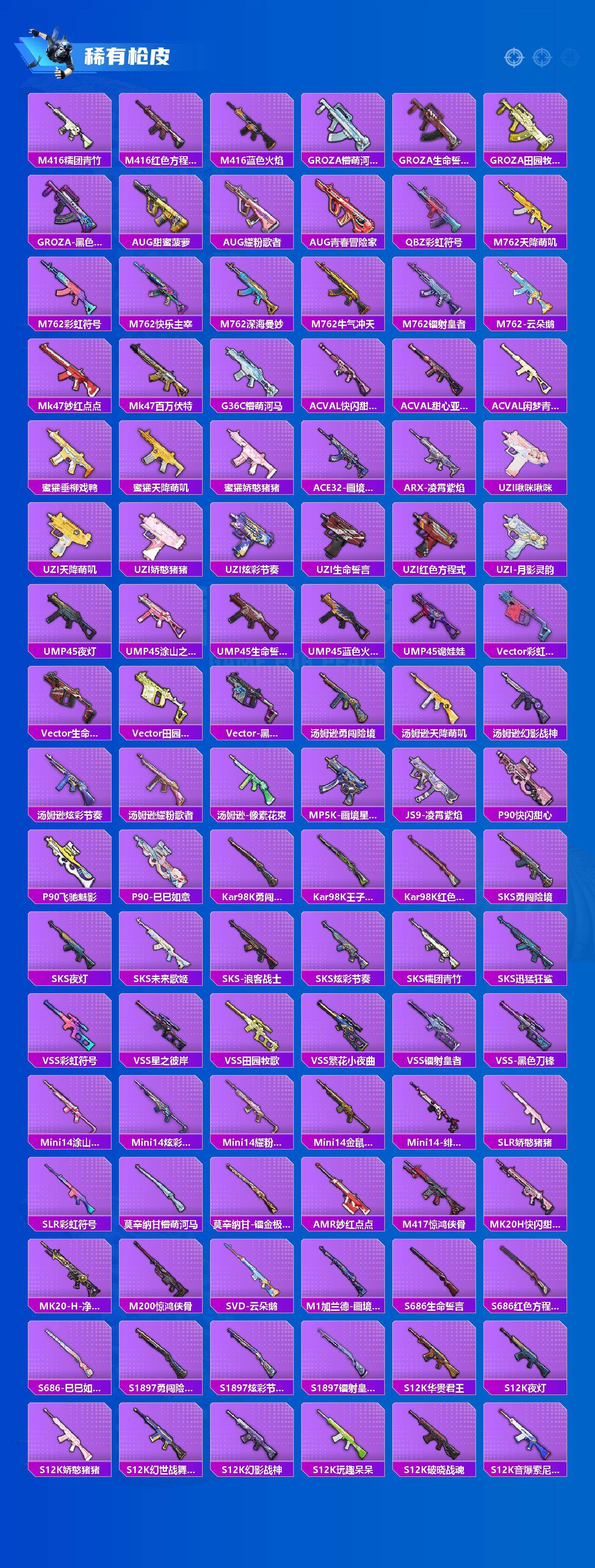 【粉色枪皮等级】:AKM-绿萝繁花(五级),SCAR-L-锦绣绵绵(五级),M416-电玩时刻(五级),AUG-暖羊咩咩(五级),ACE32-萌骑漫游(三级),UMP45-量子极限(五级),AKS-74U-星穹咏叹调(七级),P90-金丰海韵(七级),Ka
