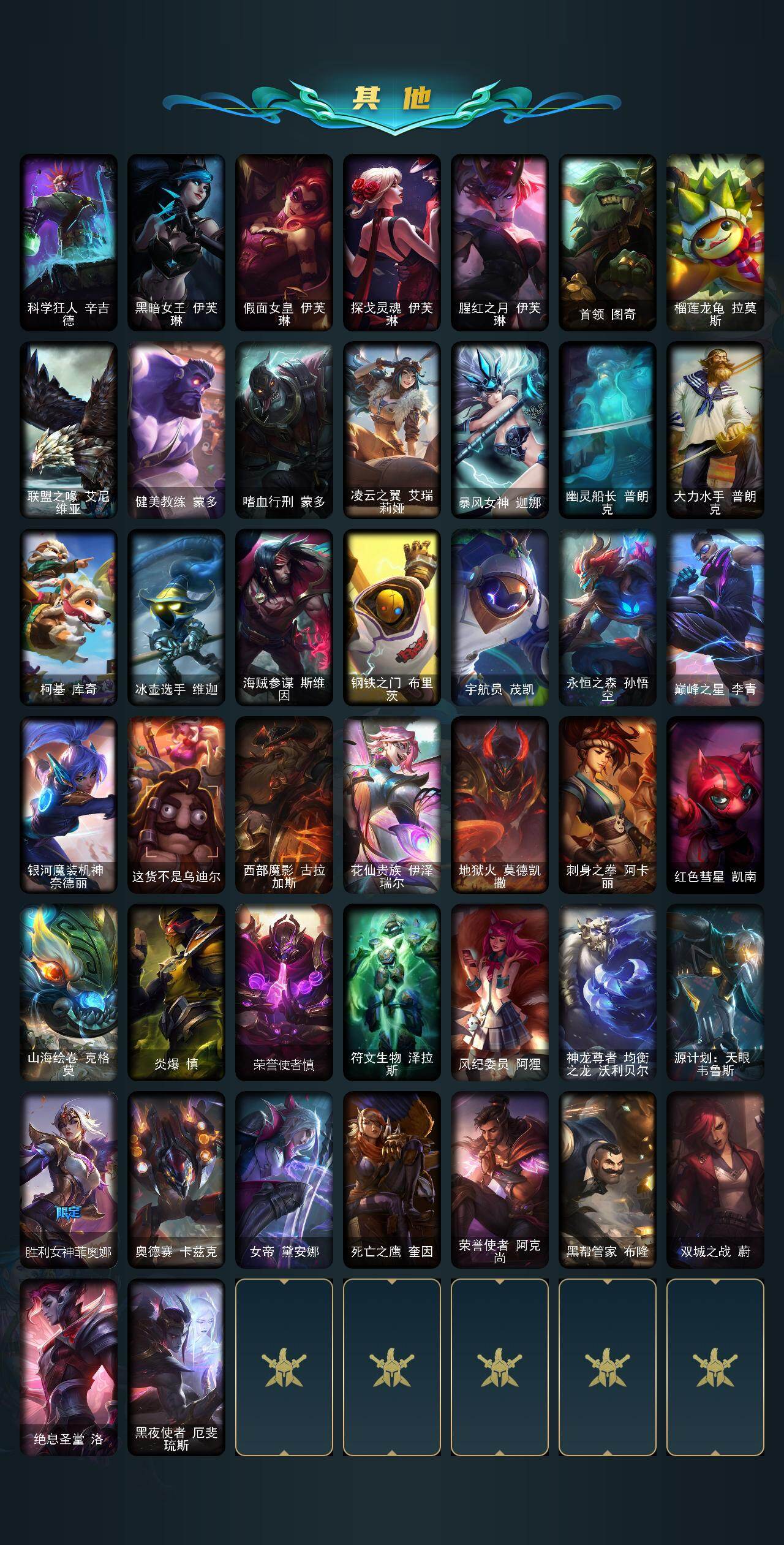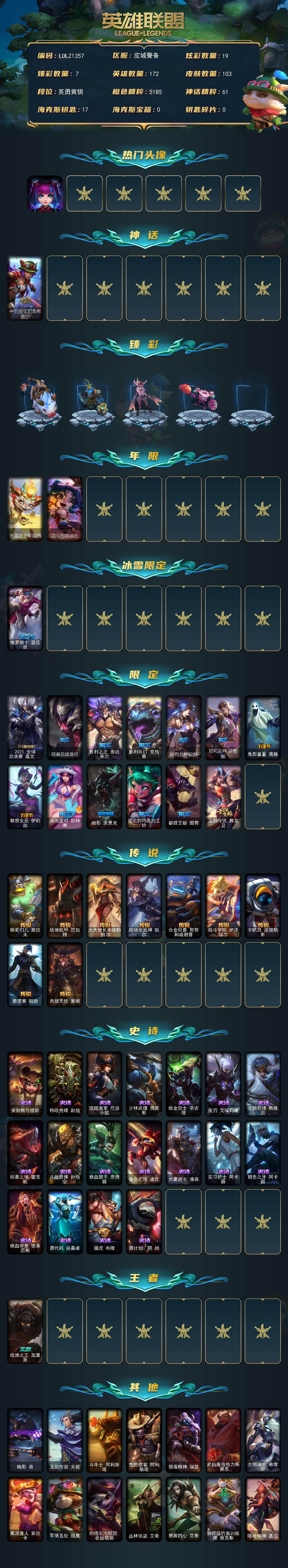 【LOLZ1357】172英雄/103皮肤/1神话/17限定/7臻彩/19炫彩/9传说/18史诗/青铜/银河魔装机神安妮头像/十五周年纪念希维尔/无畏骑士瑟庄妮赤子初心/冠军典狱长锤石凯旋圣装/破败军团厄运小姐灵岛征伐使/灵魂莲华亚索霜见之时/可爱可爱粉红红布里茨/星之守护者阿卡丽未来之光/红莲之刃锐雯/天龙之子斯莫德/龙马烈焰波比/魄罗骑士瑟庄妮/2021全球总决赛嘉文四世/暗裔英雄盖伦/胜利之王泰达米尔/胜利巨口克格莫/胜利女神娑娜/胜利女神菲奥娜/鬼影重重魔腾/魅惑女巫伊莉丝/泳池派对凯特