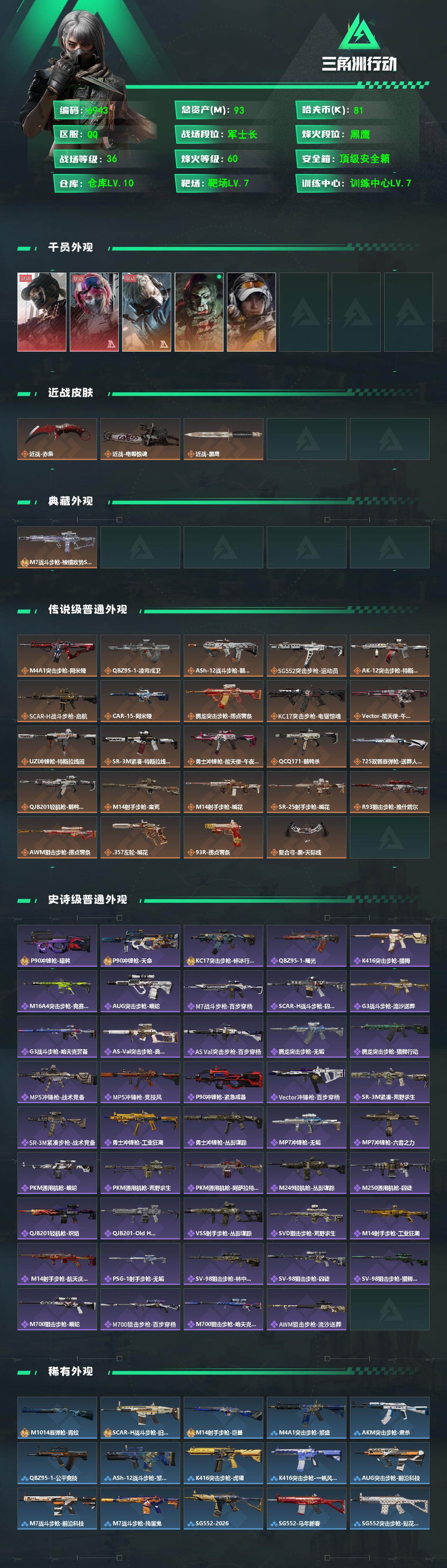 {特价出售}《 赛季九格4月16号到期》等级:60总资产:93.3M 纯币81427 隐藏挂饰:4S肘击王 红皮: 露娜-黑天际线/蛊-能天使午夜邮差 刀皮: 近战-赤枭/近战-电锯惊魂 砖皮: M7战斗步枪-棱镜攻势S2(优品B) 特勤处:仓库10,训练7,靶场7 部门44444蜂医-送葬人·无题密令,红狼-电锯惊魂,露娜-金牌射手