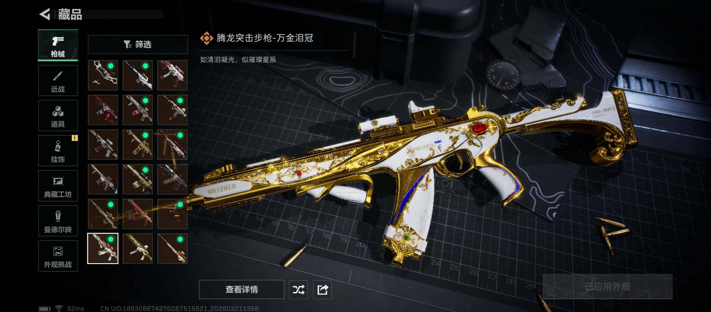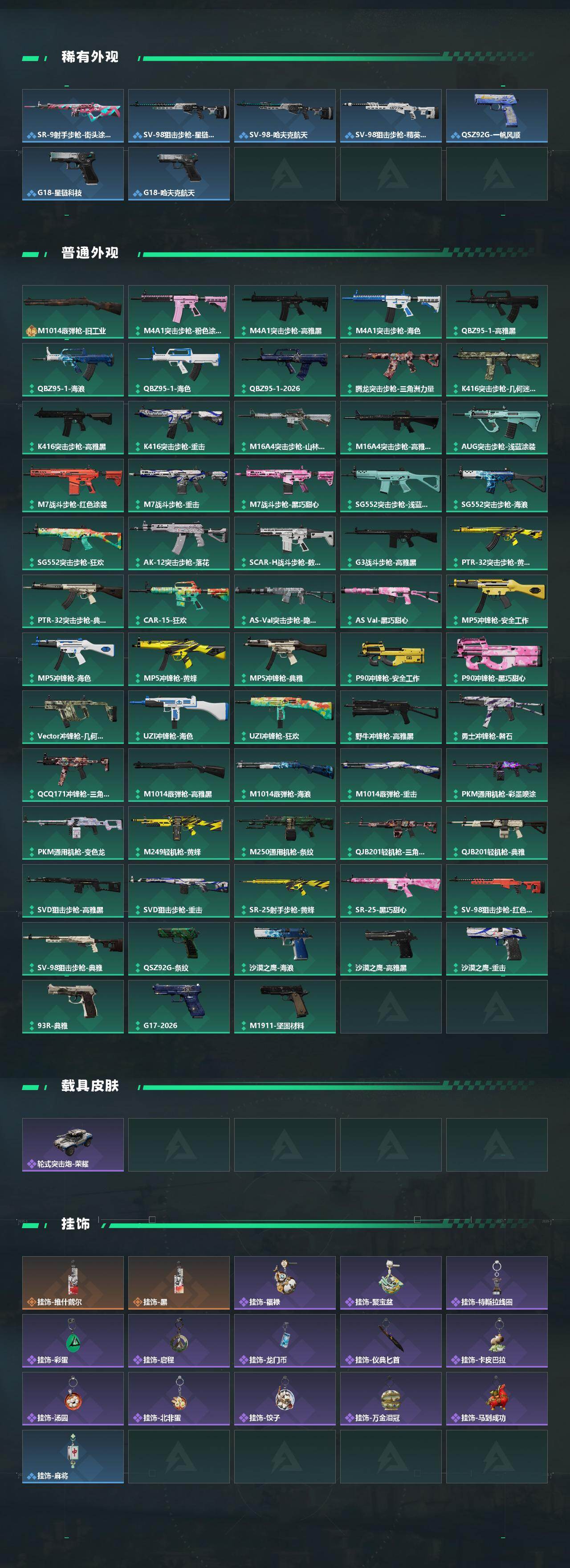 【传说外观】:M4A1突击步枪-蚀金玫瑰,M4A1突击步枪-阿米娅,AK-12突击步枪-特斯拉线圈,SCAR-H战斗步枪-启航,G3战斗步枪-骑士,CAR-15突击步枪-阿米娅,腾龙突击步枪-马年祥瑞,腾龙突击步枪-万金泪冠,KC