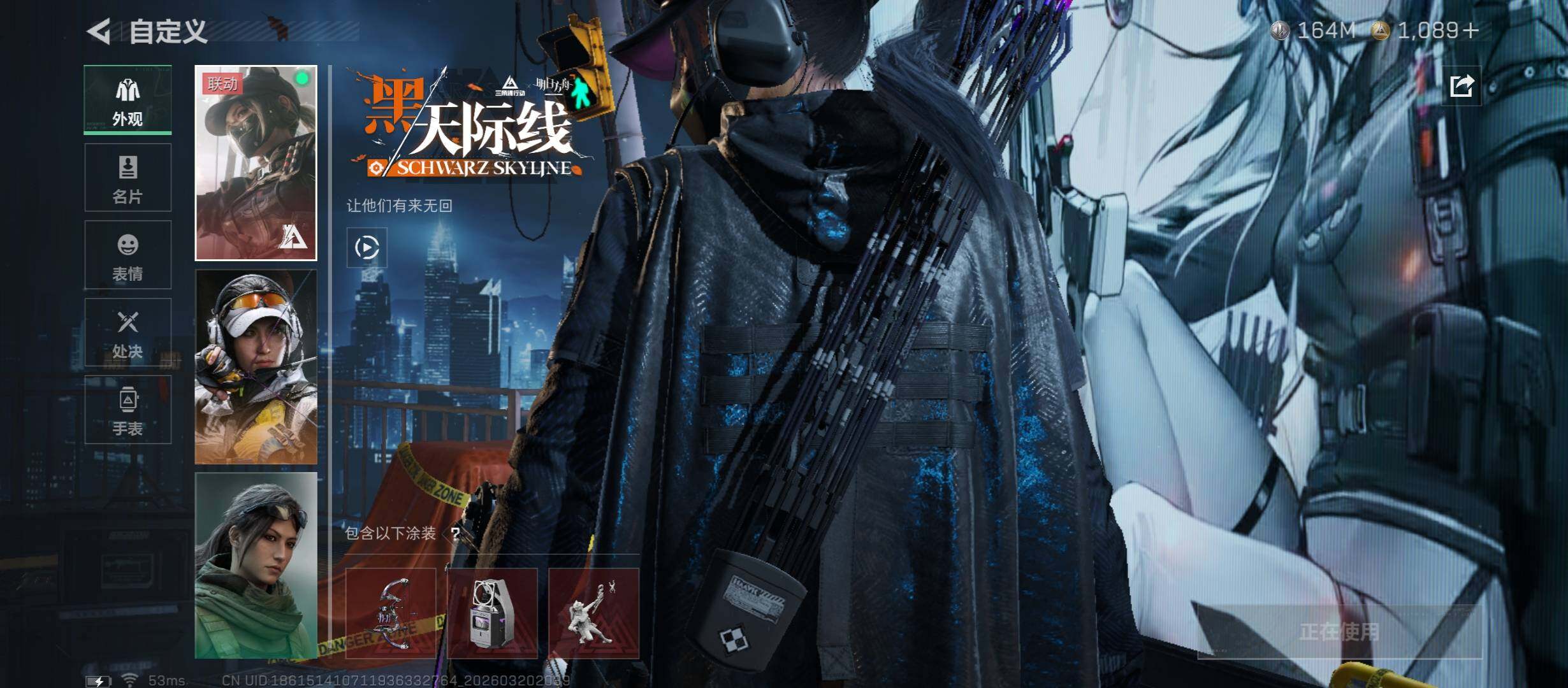 【干员外观】:红狼-蚀金玫瑰,露娜-黑·天际线,威龙-凌霄戍卫,威龙-铁面判官,威龙-壮志凌云,蜂医-送葬人·无题密令,牧羊人-街头之王,无名-夜鹰,深蓝-不破誓约,红狼-电锯惊魂,露娜-金牌射手,乌鲁鲁-荒原猎手