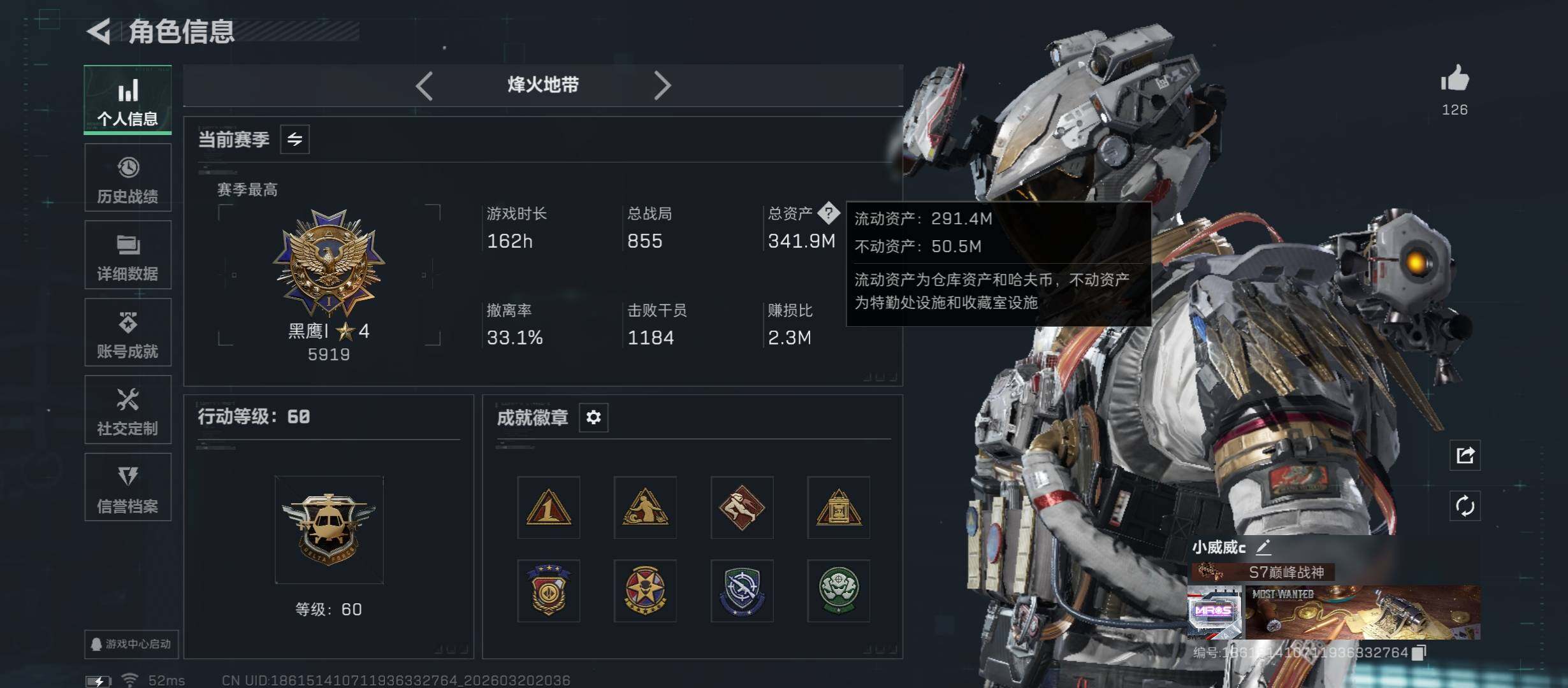 仓库9级/靶场7级/训练中心7级-总资产341m-哈夫币164m-烽火等级:60级