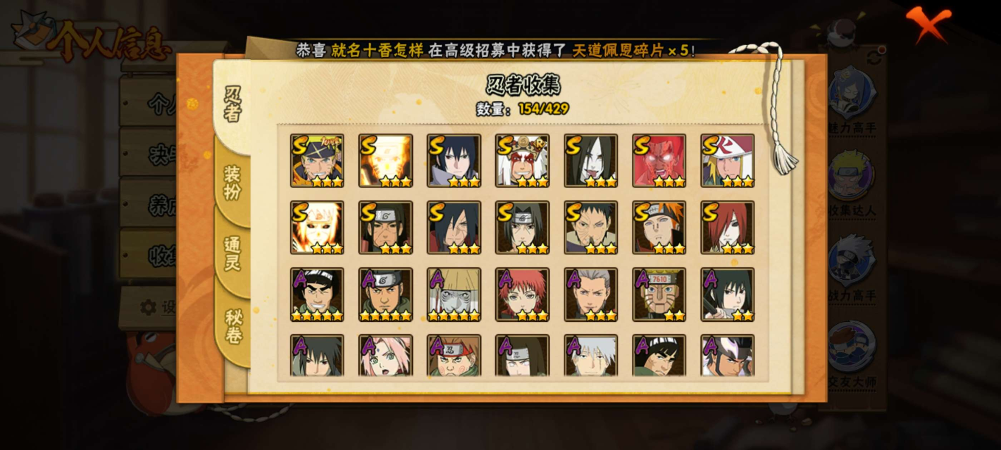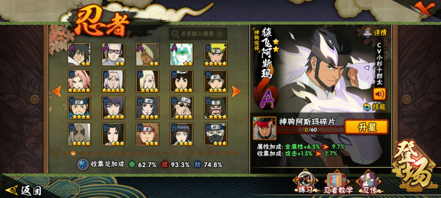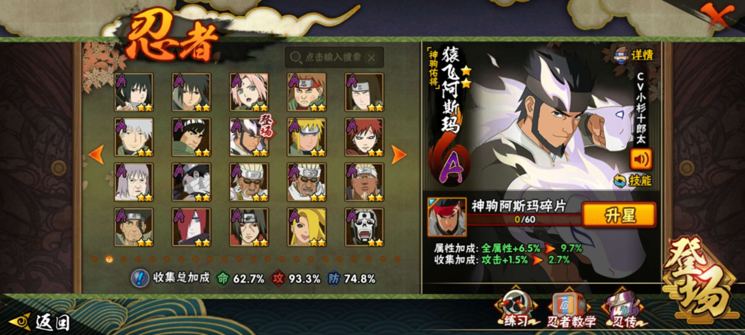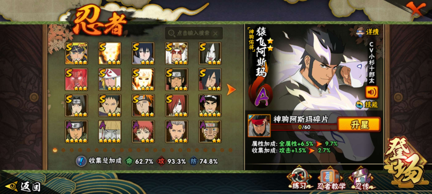 【S级忍者】宇智波带土「忍界大战」(3星),迈特凯「死门」(3星),宇智波斑「秽土转生·解」(3星),宇智波佐助「永恒万花筒」(3星),千手柱间「秽土转生」(3星),长门「秽土转生」(3星),漩涡鸣人「九喇嘛连结」(3星),波风水门「九喇嘛连结」(3星),自来也「舞之豪杰」(3星),