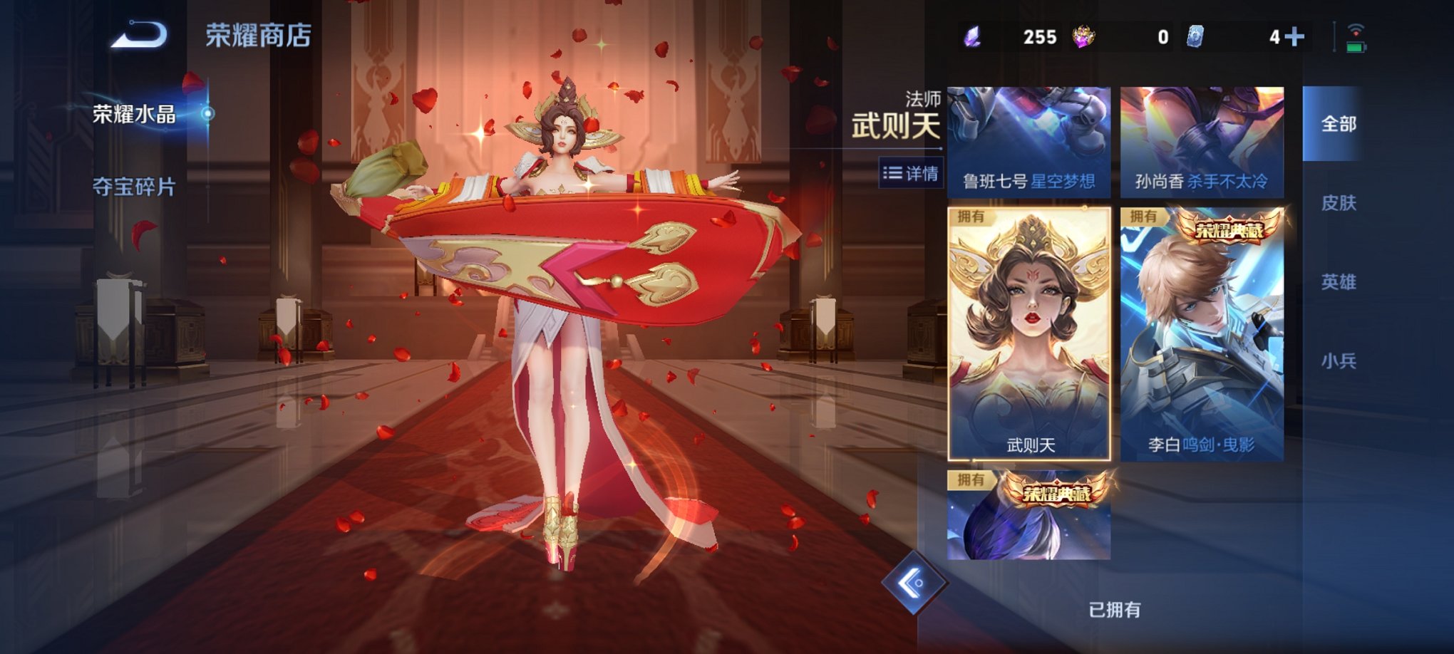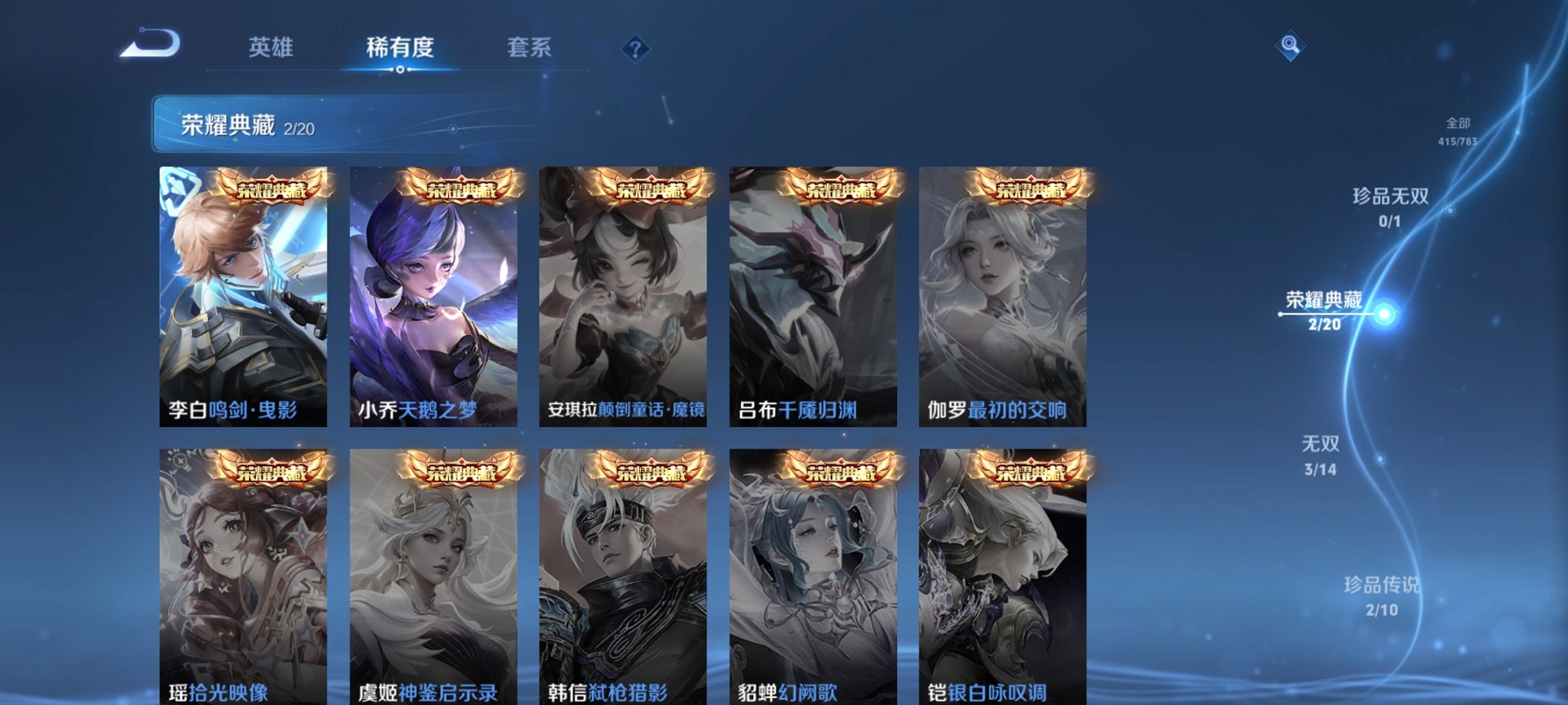 V10 国服虞姬415皮肤3水晶3无双2珍品55传说2星元发育路43段