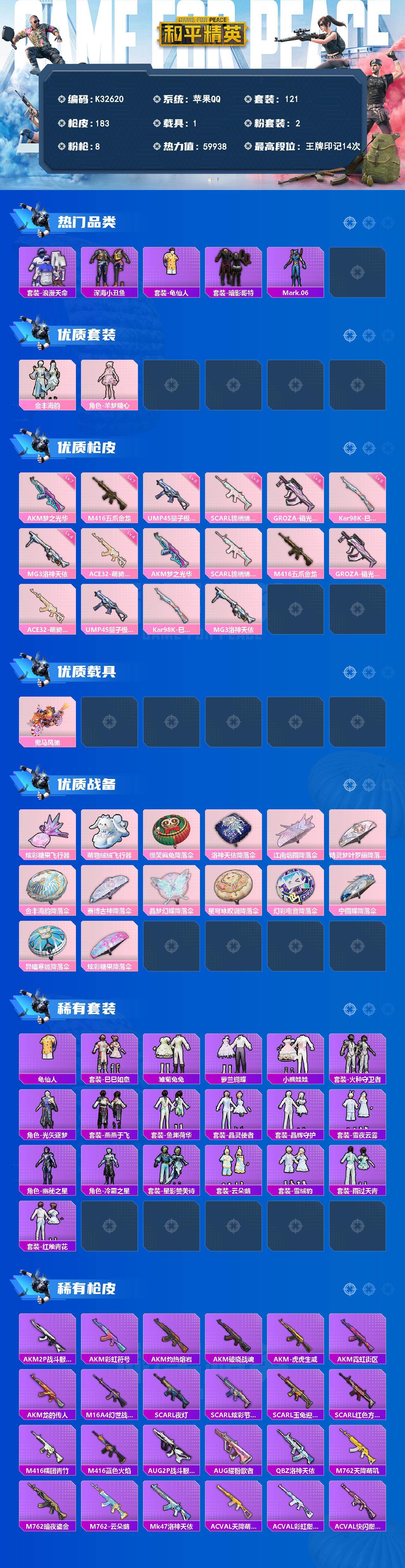 苹果 手Q-2粉装-8特效枪-1载具-3粉色飞行器-59938热力值-14王牌印记-121套装-183枪皮