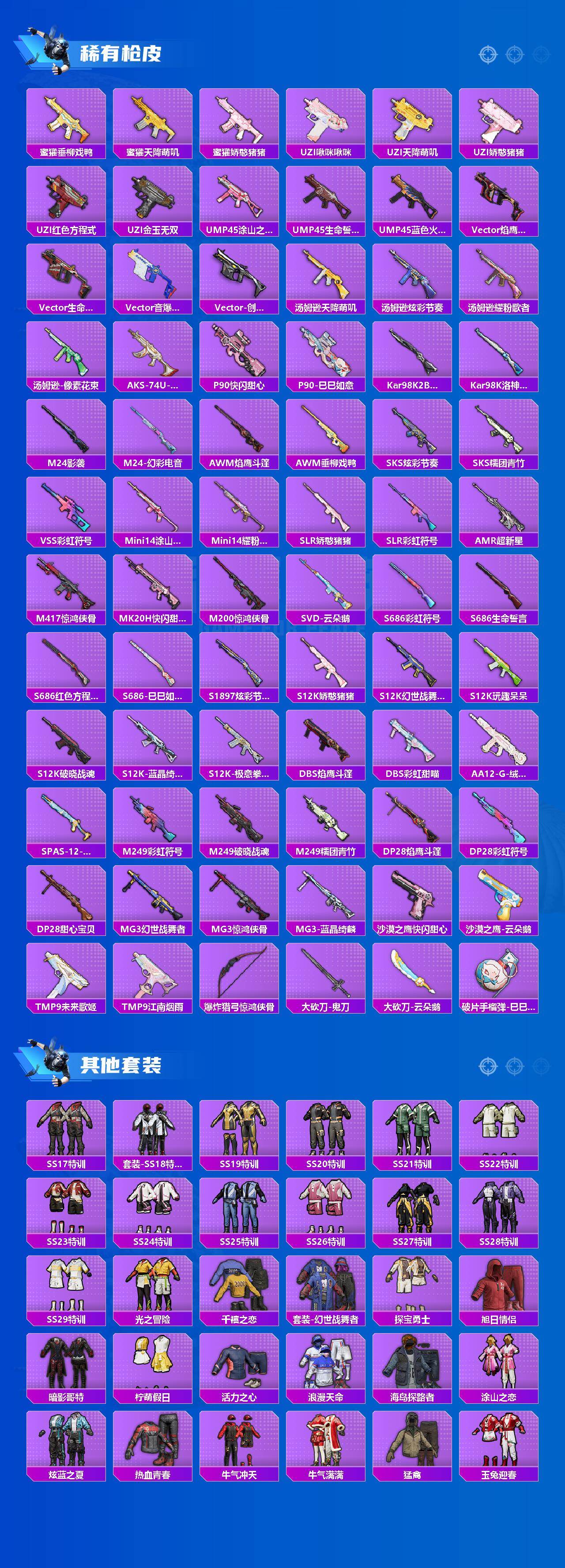 【粉色枪皮等级】:AKM-梦之光华(七级),SCAR-L-锦绣绵绵(五级),M416-五爪金龙(七级),GROZA-镜光银凌(五级),ACE32-萌骑漫游(四级),UMP45-量子极限(五级),Kar98K-巳巳如意(五级),MG3-洛神天依(四